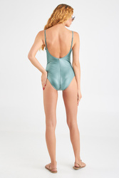 Jednoczęściowy strój kąpielowy w wyjątkowym, miętowym kolorze. Miseczki usztywniane. Doskonale eksponujące biust i dekolt. Ramiączka wąskie, regulowane z tyłu. Z przodu strój posiada ozdobne marszczenia, które optycznie wysmuklą sylwetkę. Tył stroju z głębokim wycięciem i niewielką złotą aplikacją sygnowaną nazwą marki. Delikatny, kobiecy i zmysłowy. Wykonany z wysokiej jakości, szybkoschnącej tkaniny.