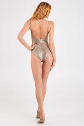 Jednoczęściowy strój kąpielowy w złotym kolorze. Miseczki usztywnione, ładnie eksponują biust. Ramiączka wąskie, regulowane z tyłu. Z przodu ozdobne marszczenia, które optycznie wysmuklą sylwetkę. Tył stroju głęboko wycięty, z niewielką metalową aplikacją sygnowaną nazwą marki. Strój delikatny i elegancki. Doskonale uzupełni garderobę każdej fashionistki.