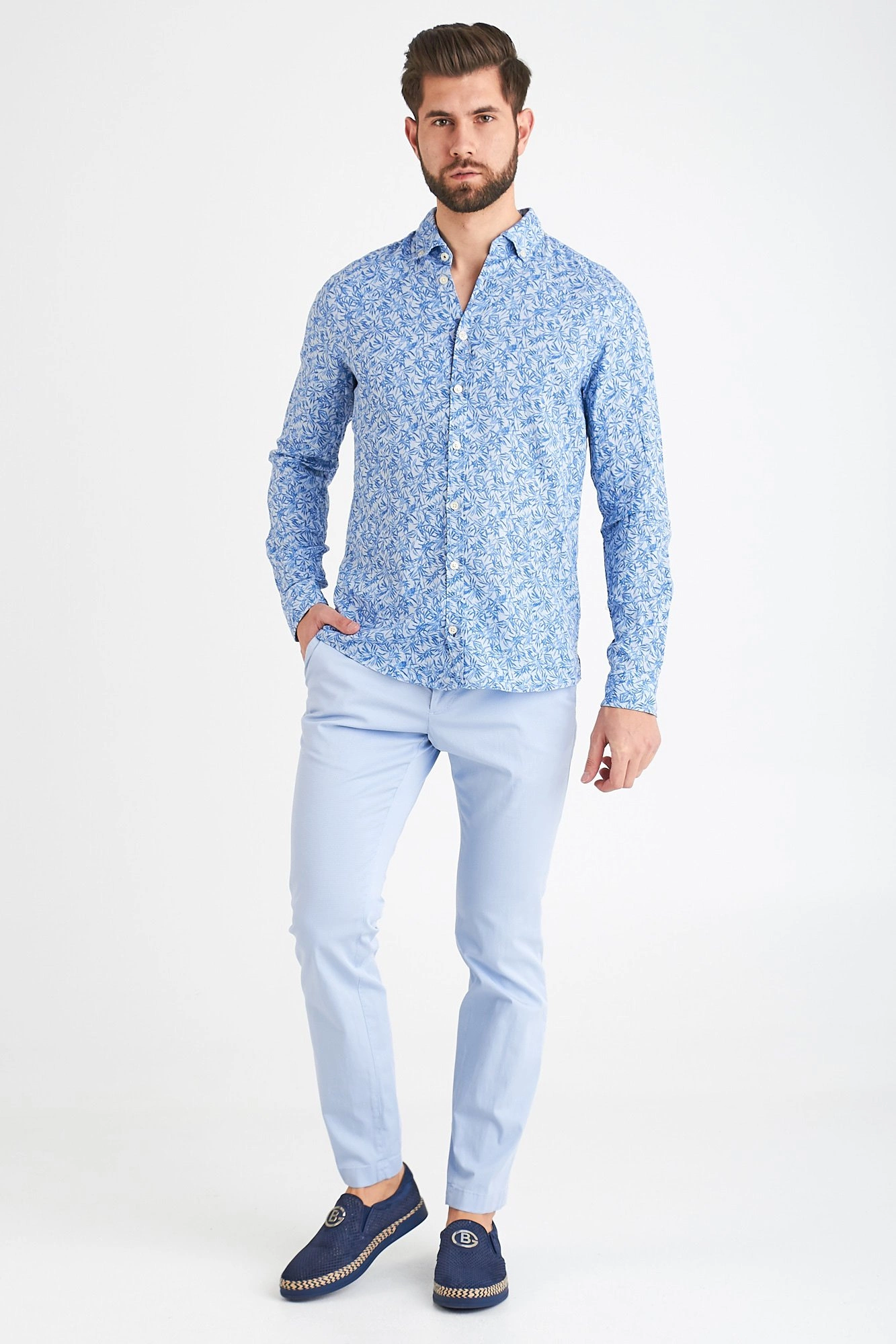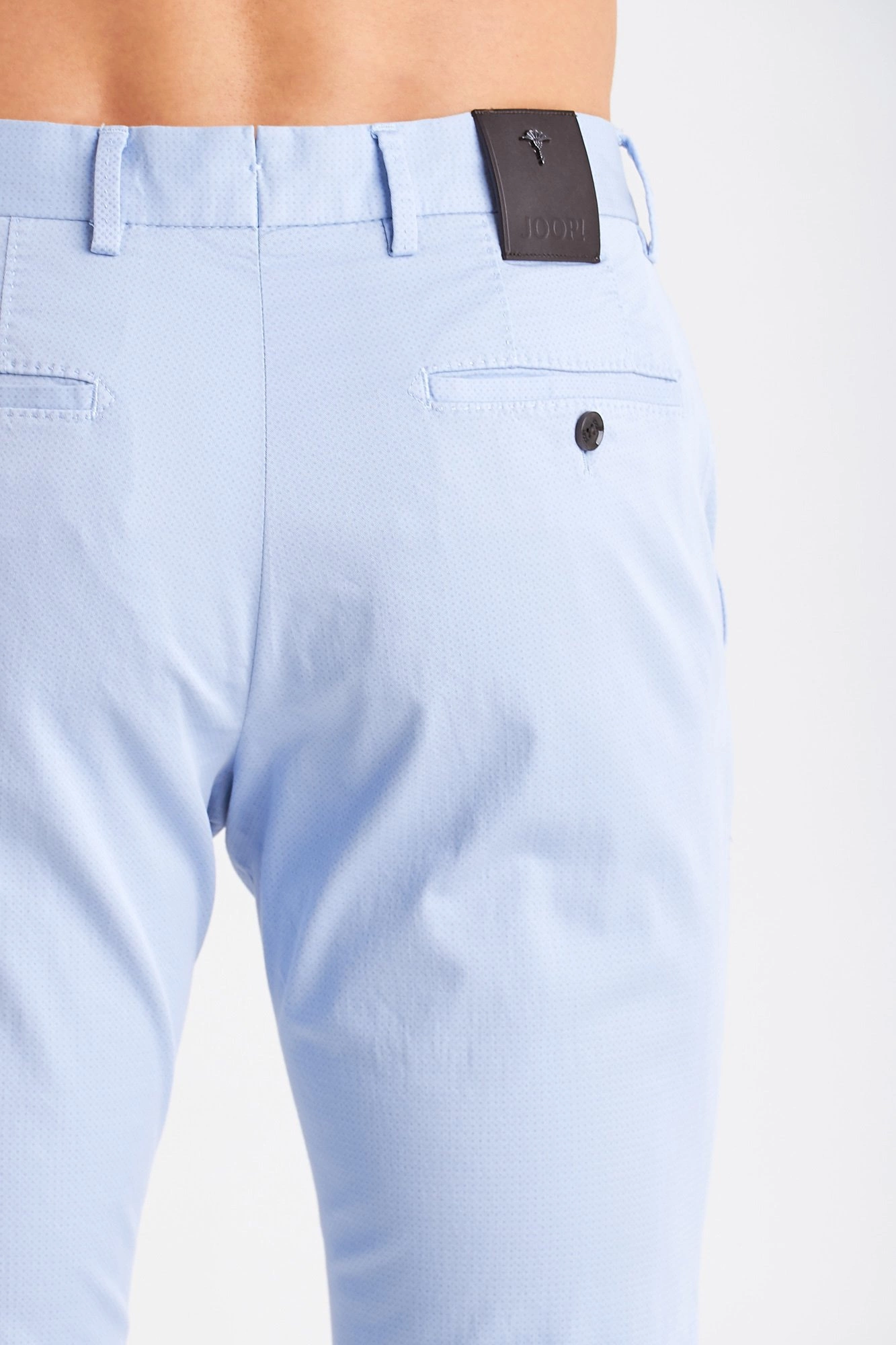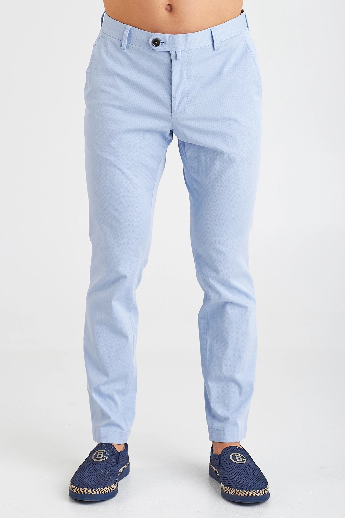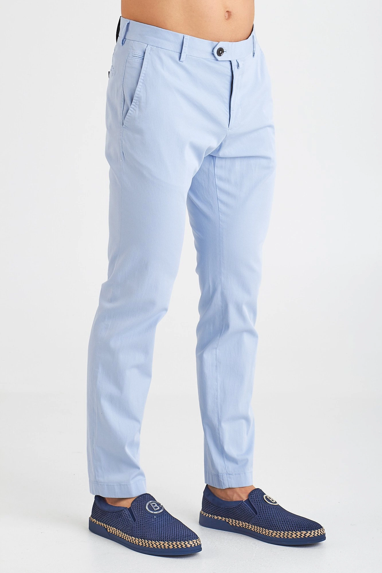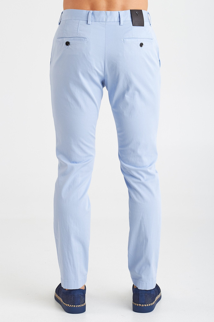 Spodnie typu chino w kolorze błękitnym. Zapinane na guzik i zamek. Z przodu dwie kieszenie. Z tyłu dwie, zapinane na guzik kieszenie. Nad prawą czarna aplikacja z nazwą i logo marki. Nogawki proste. Spodnie wykonane z wysokiej jakości bawełny z domieszką elastanu. Wygodne, lekkie i przyjemne w dotyku.