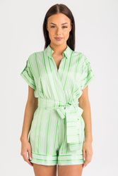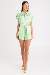 Kombinezon w zielono-białe paski. Dekolt kopertowy z kołnierzykiem. Kombinezon zapinany z tyłu na kryty zamek i haftkę. Rękaw krótki z ozdobną patką, zapinaną na złoty guzik sygnowany logo marki. Wiązany w pasie przy pomocy paska w tych samych kolorach. Po bokach dwie, niezapinane kieszenie. Dół w postaci krótkich spodenek. Z tyłu ozdobne rozcięcie oraz dwie kieszenie zapinane na guzik sygnowany logo marki. Wykonany z wysokiej jakości, lekko połyskującego materiału. Lekki, delikatny i komfortowy.