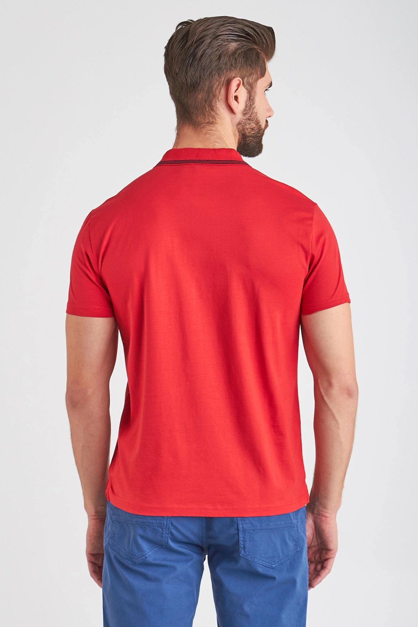 Czerwone polo. Zapinane na trzy guziki, sygnowane logo marki. Z przodu wyhaftowane logo marki. Kołnierzyk wykończony czarnymi paseczkami. Wykonane z wysokiej jakości bawełny. Miękkie i wygodne.