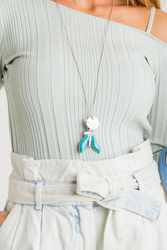 Naszyjnik w kolorze srebrnym. Zawieszka w kształcie logo marki - ważki. Skrzydła zdobione turkusowym szkłem. Umieszczona jest na łańcuszku o regulowanej długości, sygnowanym logo marki. Dodatkowo na łańcuszku okrągła zawieszka z nazwą marki w kolorze srebrnym.