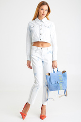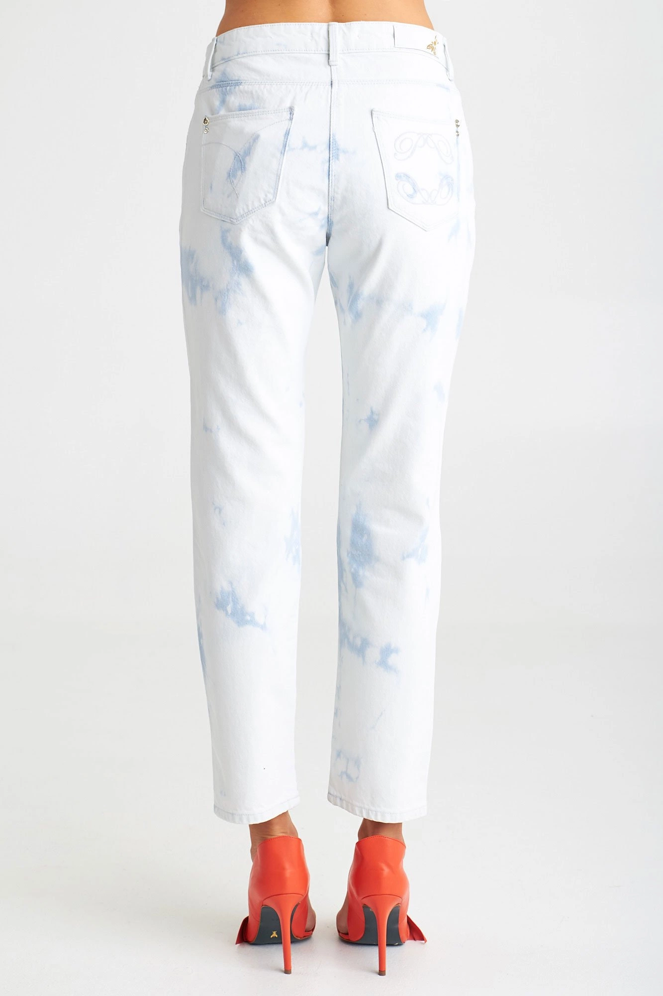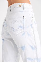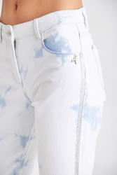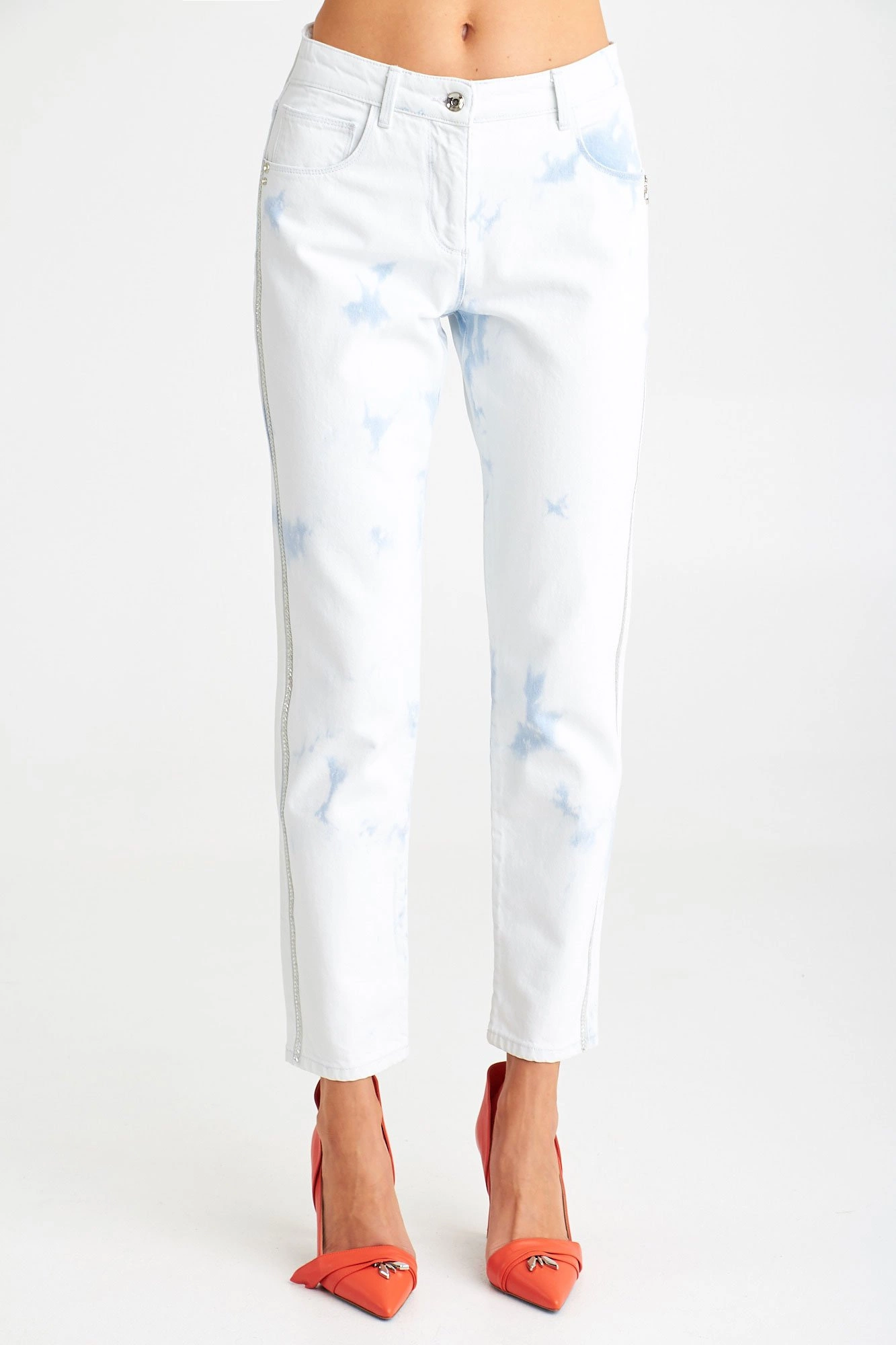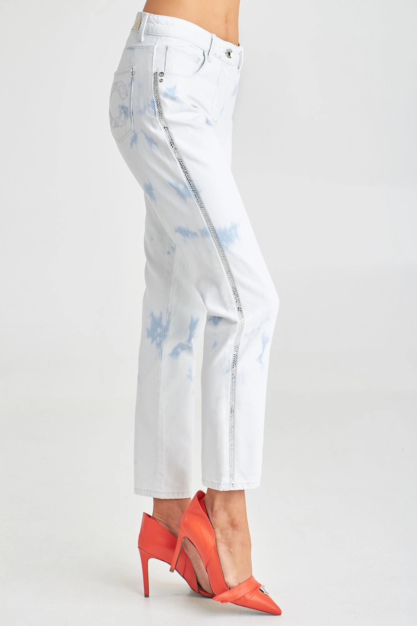Jeansy w biało - błękitnym kolorze. Na całości liczne przebarwienia. Dopasowany fason. Zapinane na zamek i guzik sygnowany logo marki. Z przodu dwie kieszenie i bilonówka. Nogawki o długości 7/8 ze srebrnymi lampasami. Z tyłu dwie kieszenie z ozdobnymi haftami.