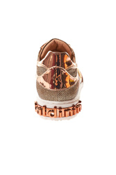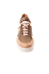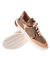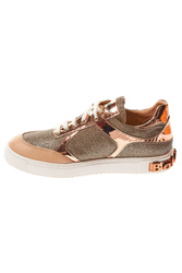 Lakierowane sneakersy w kolorze różowego złota. Wiązane na białe sznurówki. Na języku naszyta aplikacja z nazwą marki. Po zewnętrznej stronie duże logo marki. Wnętrze buta sygnowane, wykonane ze skóry naturalnej. Podeszwa biała. Z tyłu podeszwy umieszczony duży, wypukły napis w postaci nazwy marki. Lekkie i komfortowe.