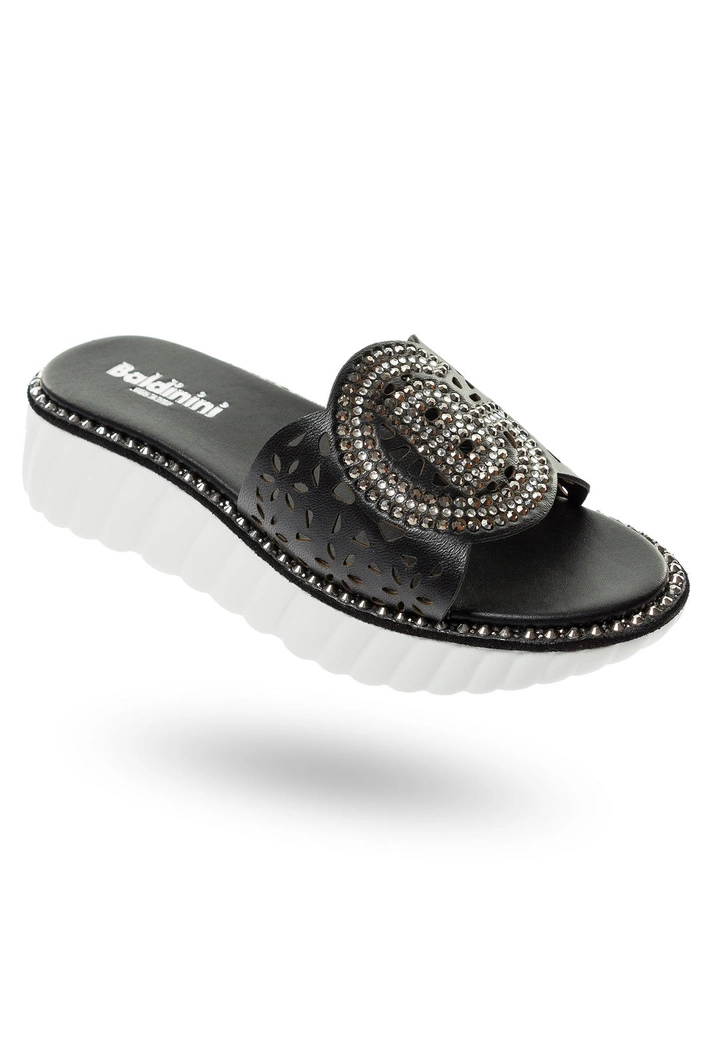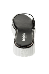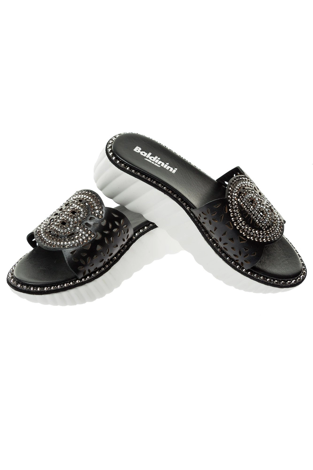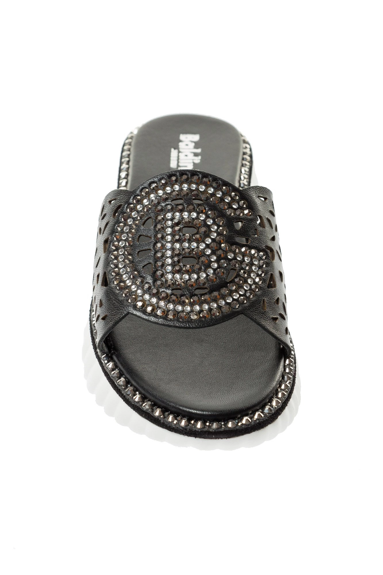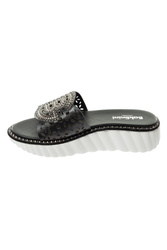 Skórzane klapki w czarym kolorze. Nosek otwarty. Z przodu duże logo marki wykonane z kryształków o tęczowym połysku. Wierzch buta w ażurowy wzór. Podeszwa biała, tłoczona, obszyta kryształkami z logo marki z tyłu. Dobrze wyprofilowane i wygodne. Ponadczasowa klasyka przełamana najnowszymi trendami.