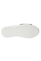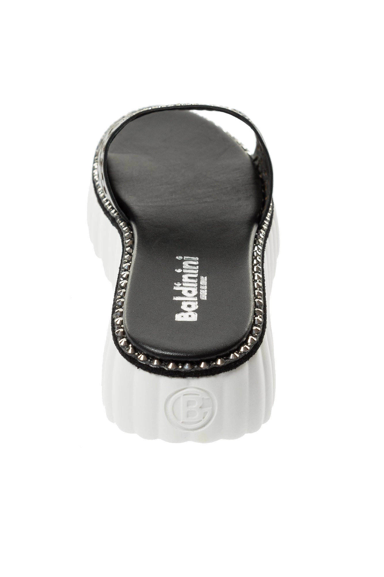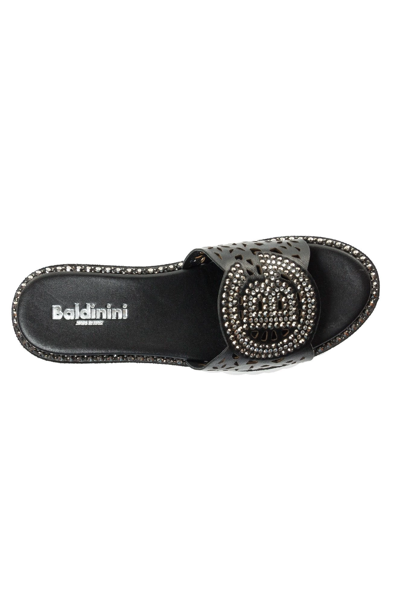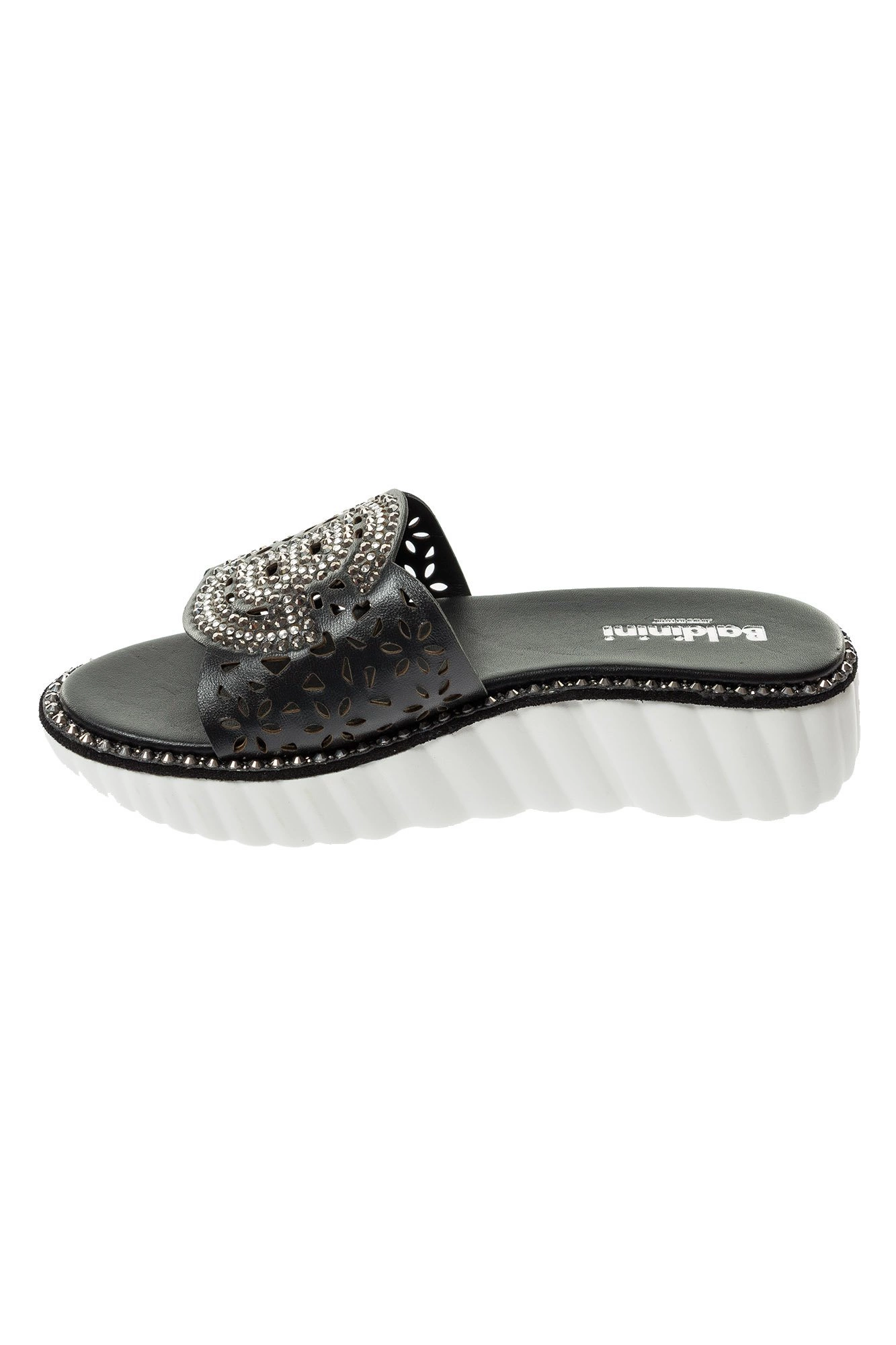 Skórzane klapki w czarym kolorze. Nosek otwarty. Z przodu duże logo marki wykonane z kryształków o tęczowym połysku. Wierzch buta w ażurowy wzór. Podeszwa biała, tłoczona, obszyta kryształkami z logo marki z tyłu. Dobrze wyprofilowane i wygodne. Ponadczasowa klasyka przełamana najnowszymi trendami.