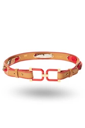 Beżowo-czerwony pasek wykonany z wysokiej jakości skóry ekologicznej. Na całości umieszczone zostały złote ringi, przez które przepleciona jest wielokolorowa szarfa. Regulacja za pomocą złotych pinów. Klamra czerwono-złota. Modny i oryginalny w formie. Doskonałe podkreślenie wielu stylizacji.