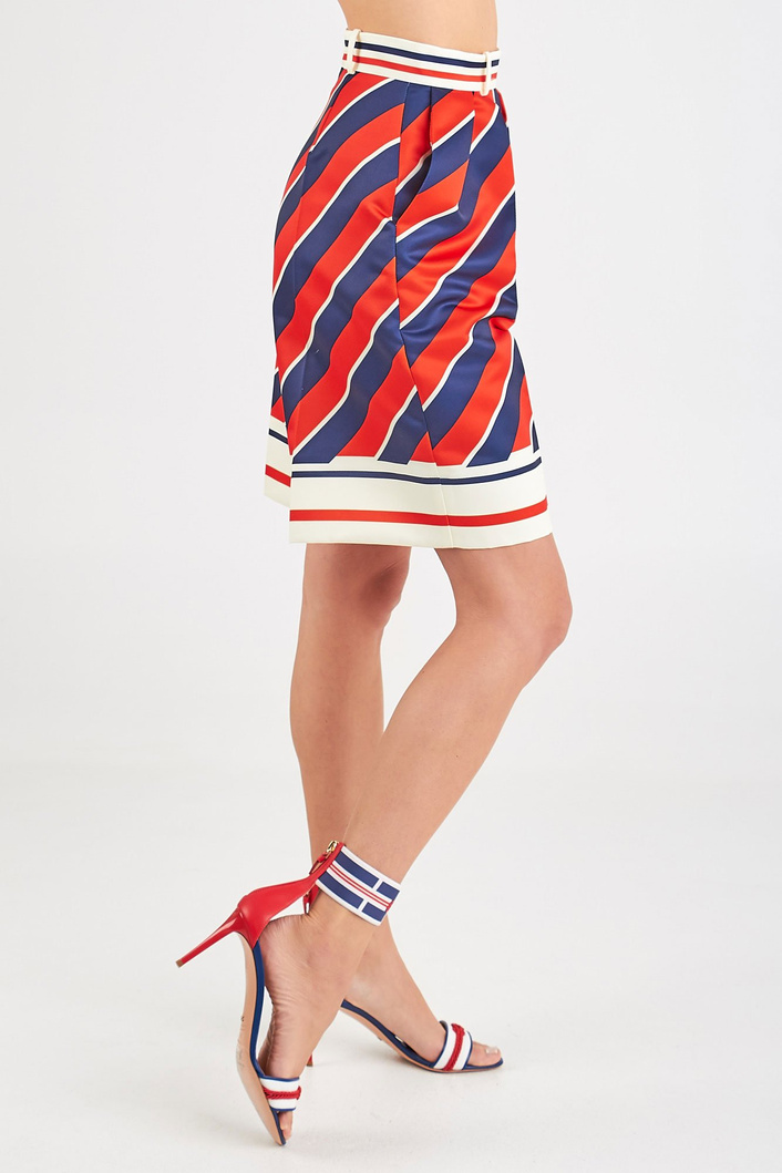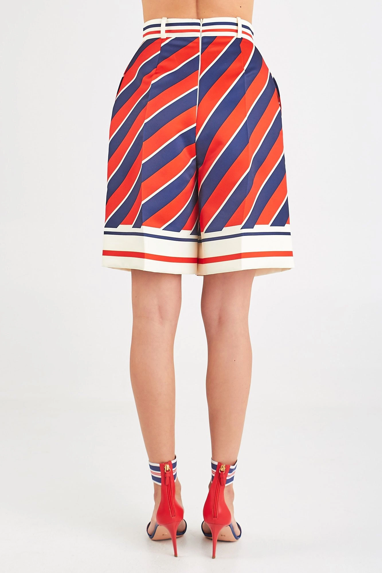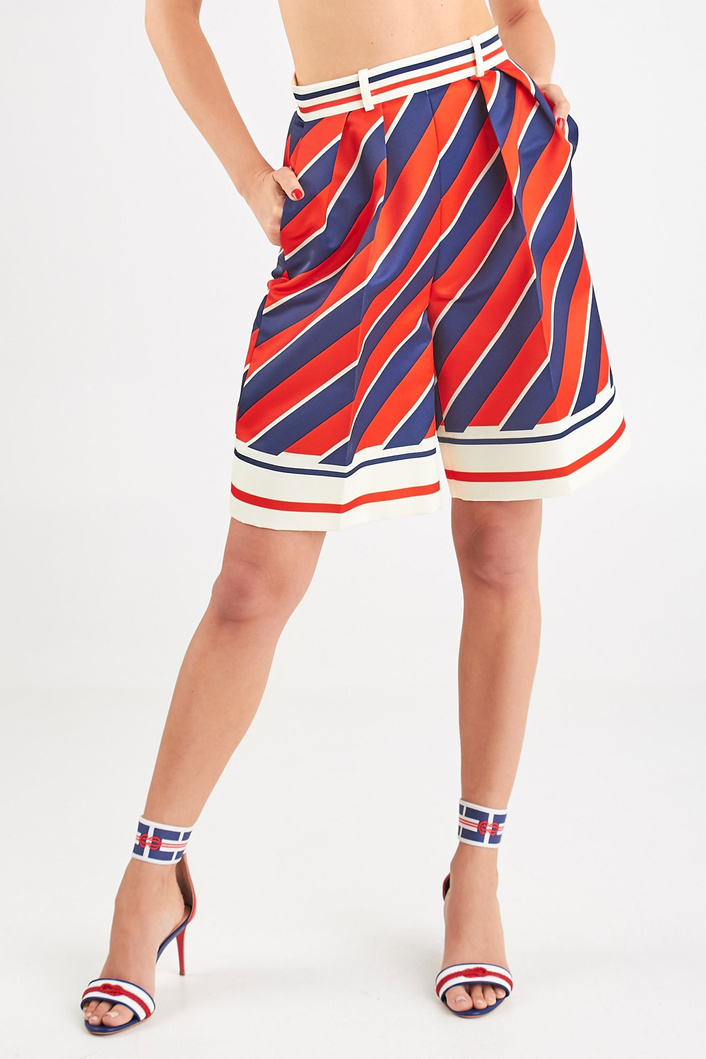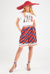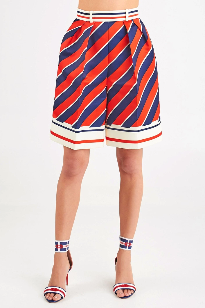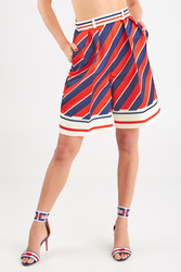 Luźne spodenki w trzech kolorach - białym, czerwonym i granatowym. Wysoki stan. Zapinane z tyłu na biały, kryty zamek. Po bokach dwie kieszenie. Z przodu ozdobne zakładki, a na nogawkach kant. Długość przed kolano i luźny , kloszowy fason sprawia że spodenki są oryginalne i ciekawe w formie. Wykonane z wysokiej jakości materiałów.