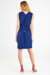 Sukienka w kolorze kobaltowym. Szerokie ramiączka zostały pięknie pomarszczone u góry. Dekolt kopertowy. Wiązana w pasie szerokim paskiem, przeplecionym przez złotą klamrę. Z tyłu dekolt typu v-neck. Dół lekko asymetryczny, zaokrąglony. Sukienka kobieca i delikatna. Doskonale podkreśla walory sylwetki. Wykonana z wysokiej jakości materiałów. Długość mini.