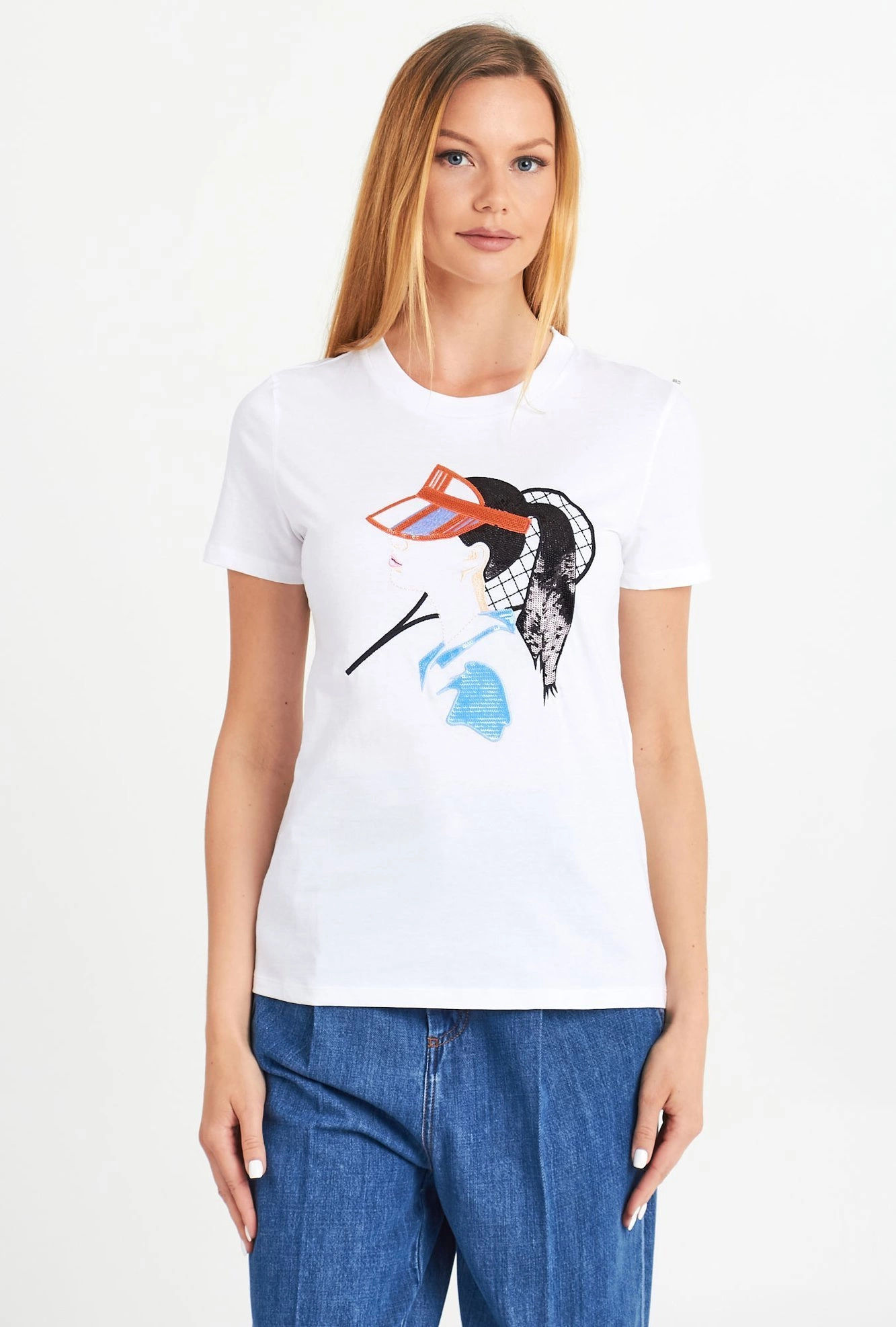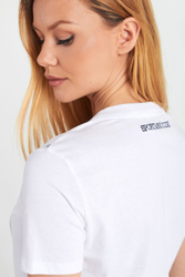 T-shirt w białym kolorze. Dekolt typu o-neck wykończony ściągaczem. Z przodu duża, wielokolorowa aplikacja wykonana z cekinów. Z tyłu, na wysokości karku nadruk w postaci nazwy marki. Wykonany z doskonałej jakości bawełny. Lekko elastyczny, wygodny i komfortowy.