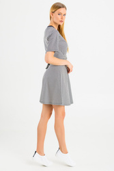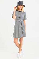 Sukienka w granatowo - białe paski. Dekolt typu o-neck. Rękawy krótkie. Dół lekko rozkloszowany. W pasie wiązana paskiem z tego samego materiału, przeplatanym przez srebrne ringi. Sukienka dziewczęca i wygodna. Wykonana z doskonałej jakości bawełny. Długość mini.