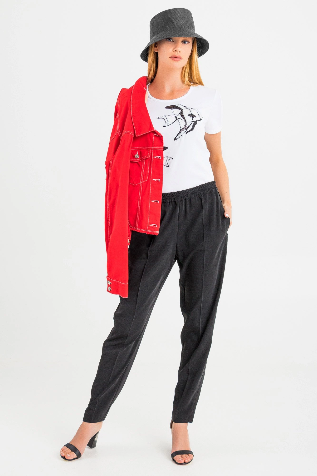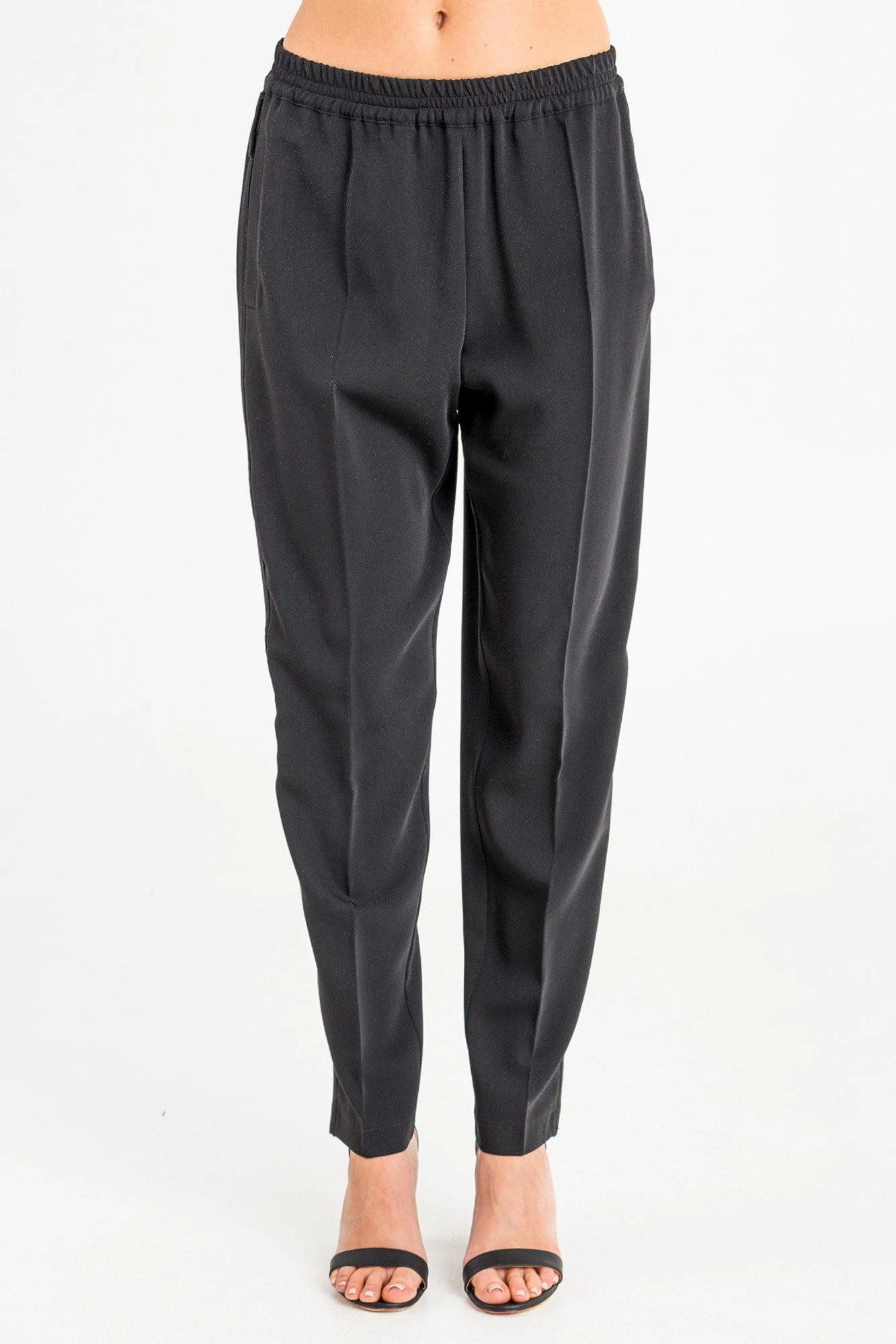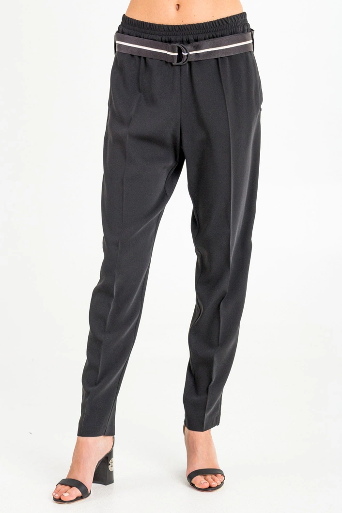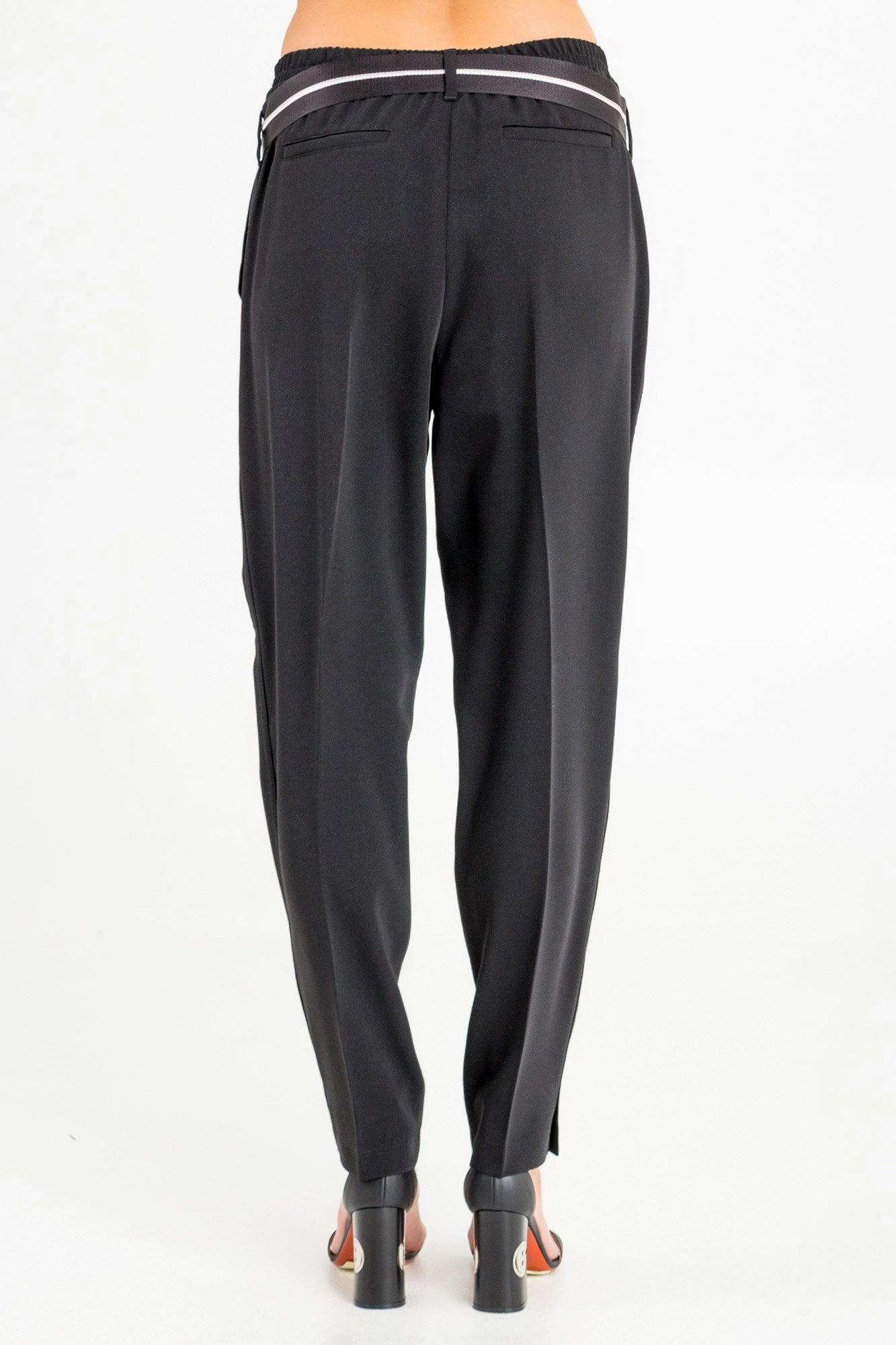 Spodnie typu kuloty w czarnym kolorze. W pasie regulowane ściągaczem. Po bokach i z tyłu po dwie kieszenie. Nogawki na kant, zwężające się ku dołowi. W komplecie czarno - biały pasek. Spodnie wyjątkowo modne w tym sezonie, przyjemne w dotyku i wygodne. Wykonane z wysokiej jakości materiału. Stanowią doskonałą bazę do wielu stylizacji.
