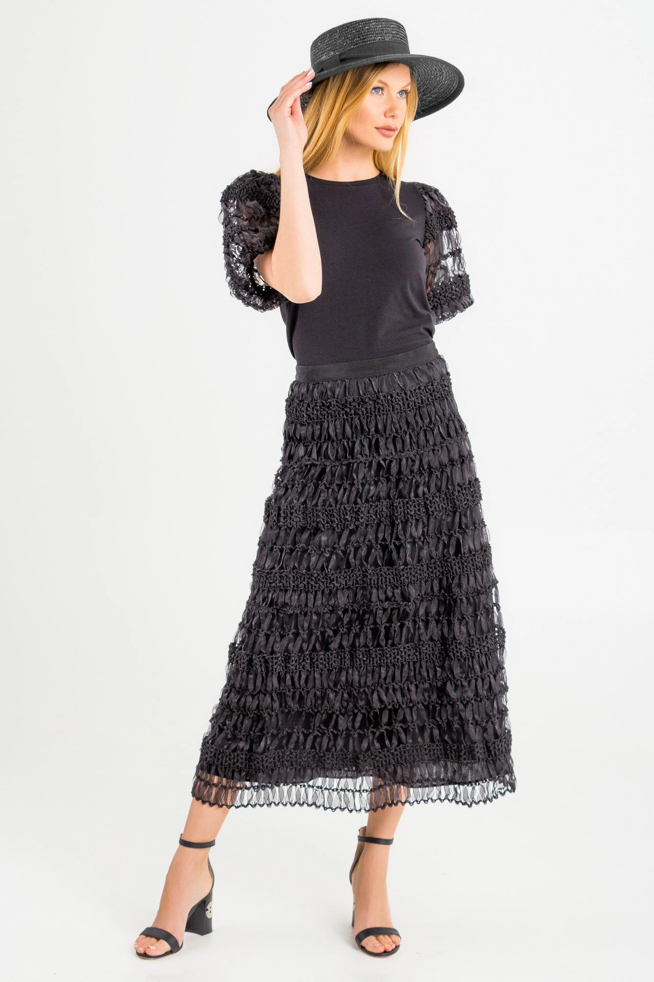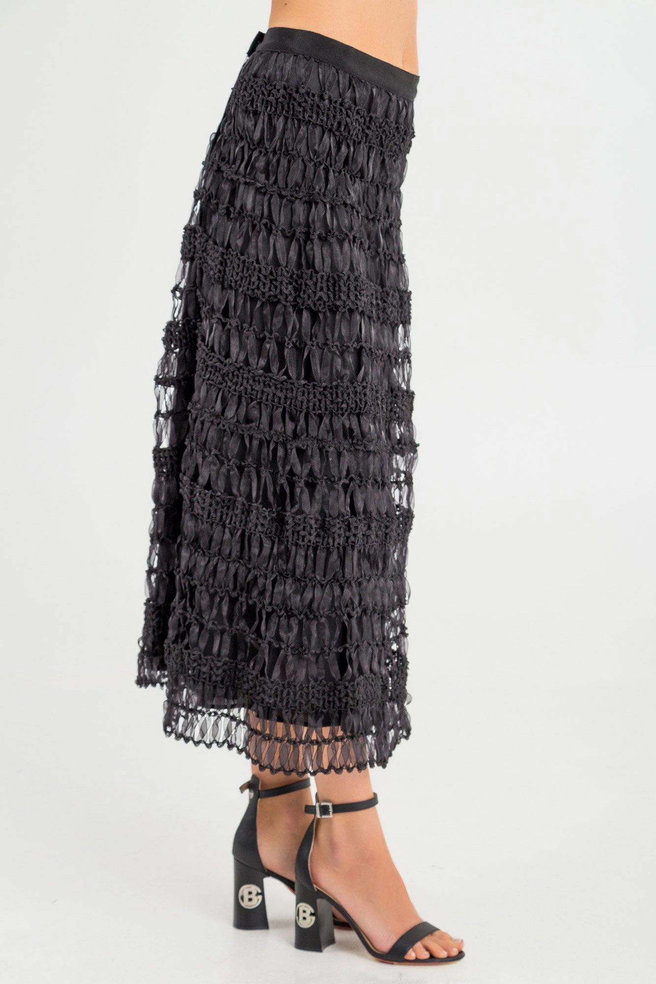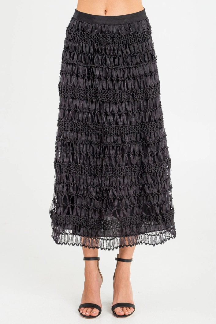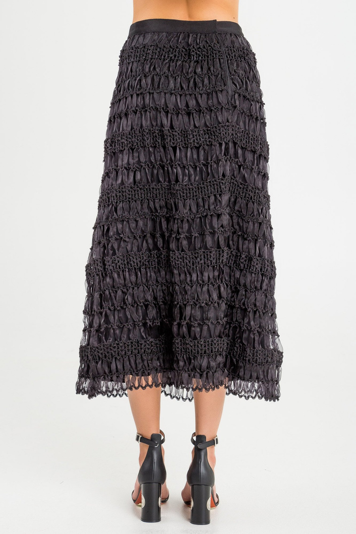 Spódnica w czarnym kolorze. Niezwykle oryginalna i stylowa. Górna warstwa stworzona została z plecionych, transparentnych tasiemek o węzełkowej teksturze. Pod spodem kryjąca halka. Spódnica zapinana z tyłu za pomocą napy. Długość midi. Wygodna i niecodzienna.