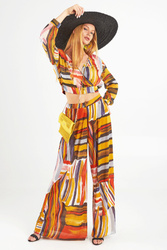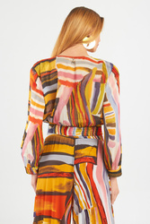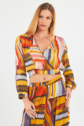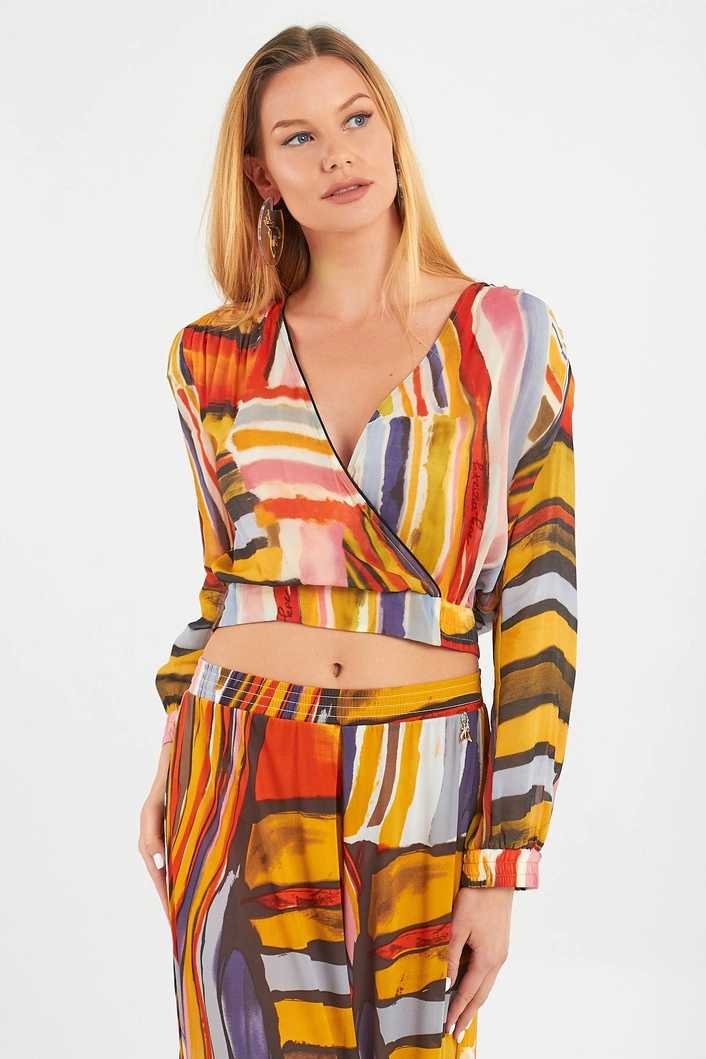 Wielokolorowa, krótka bluzka. Dekolt kopertowy. Rękaw długi, wykończony ściągaczem. Z tyłu doszyta metalowa aplikacja w złotym kolorze, charakterystyczna dla marki. Zwiewna, delikatna i zmysłowa. Idealna na lato. Wykonana z wysokiej jakości wiskozy.