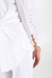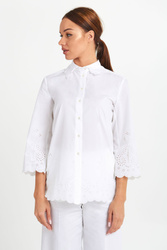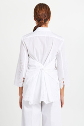 Koszula w białym kolorze. Wykonana z doskonałej jakości tkaniny. Rękawy o długości 3/4. Zapinana na białe guziczki. Kołnierzyk, rękawy i dół wykończone delikatną falą i haftem. Z tyłu ozdobny węzeł. Bardzo kobieca i delikatna. Zachwyca detalami i wysoką jakością wykonania.