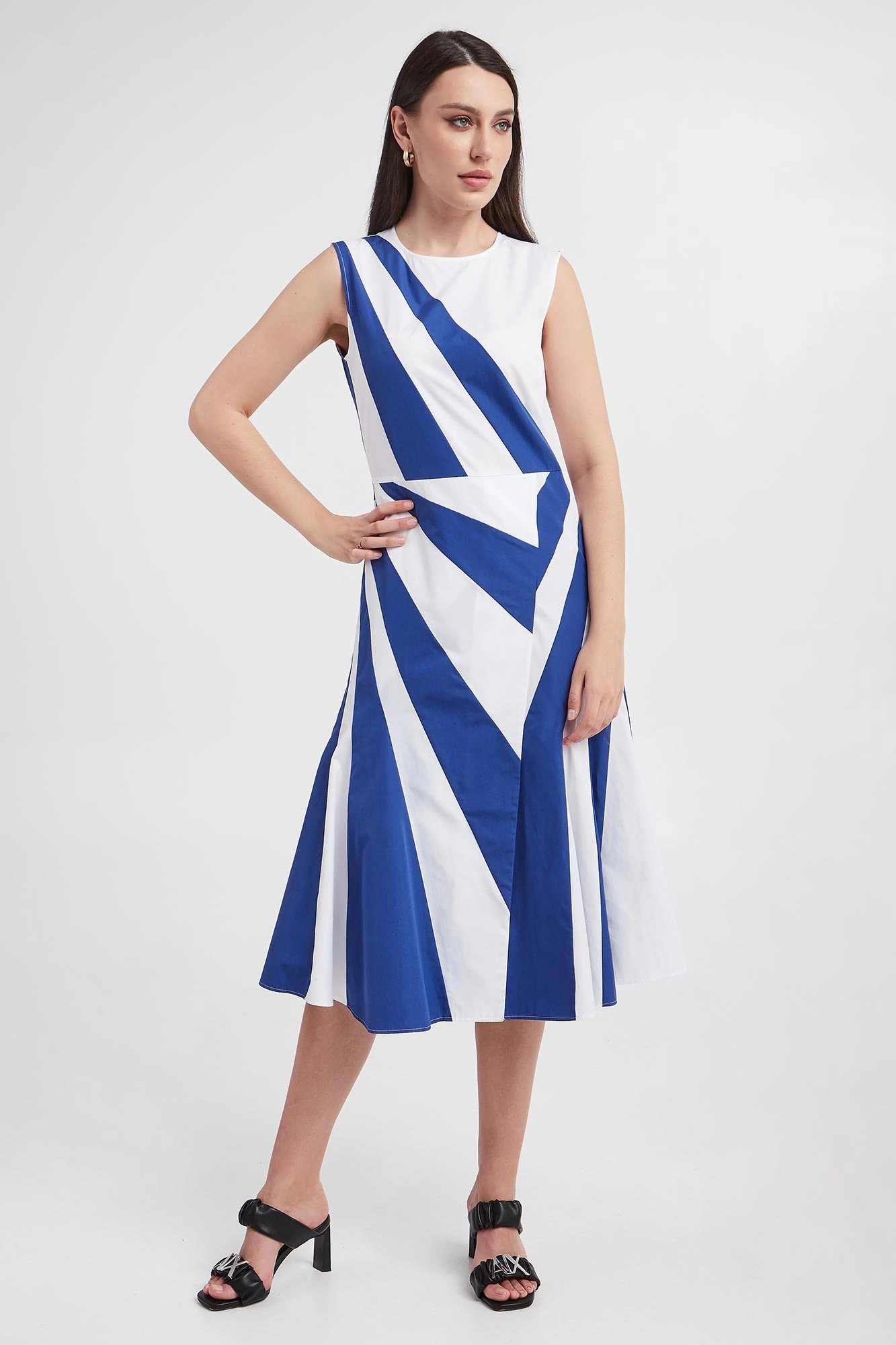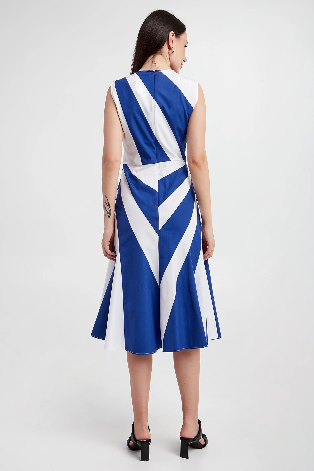 Biało - niebieska sukienka w geometryczne wzory. Szerokie ramiączka. Dekolt typu o-neck. Zapinana z tyłu na kryty zamek. Sukienka rozkloszowana, dzięki czemu jest zarazem bardzo kobieca i subtelna. Wykonana z wysokiej jakości tkaniny. Długość midi.