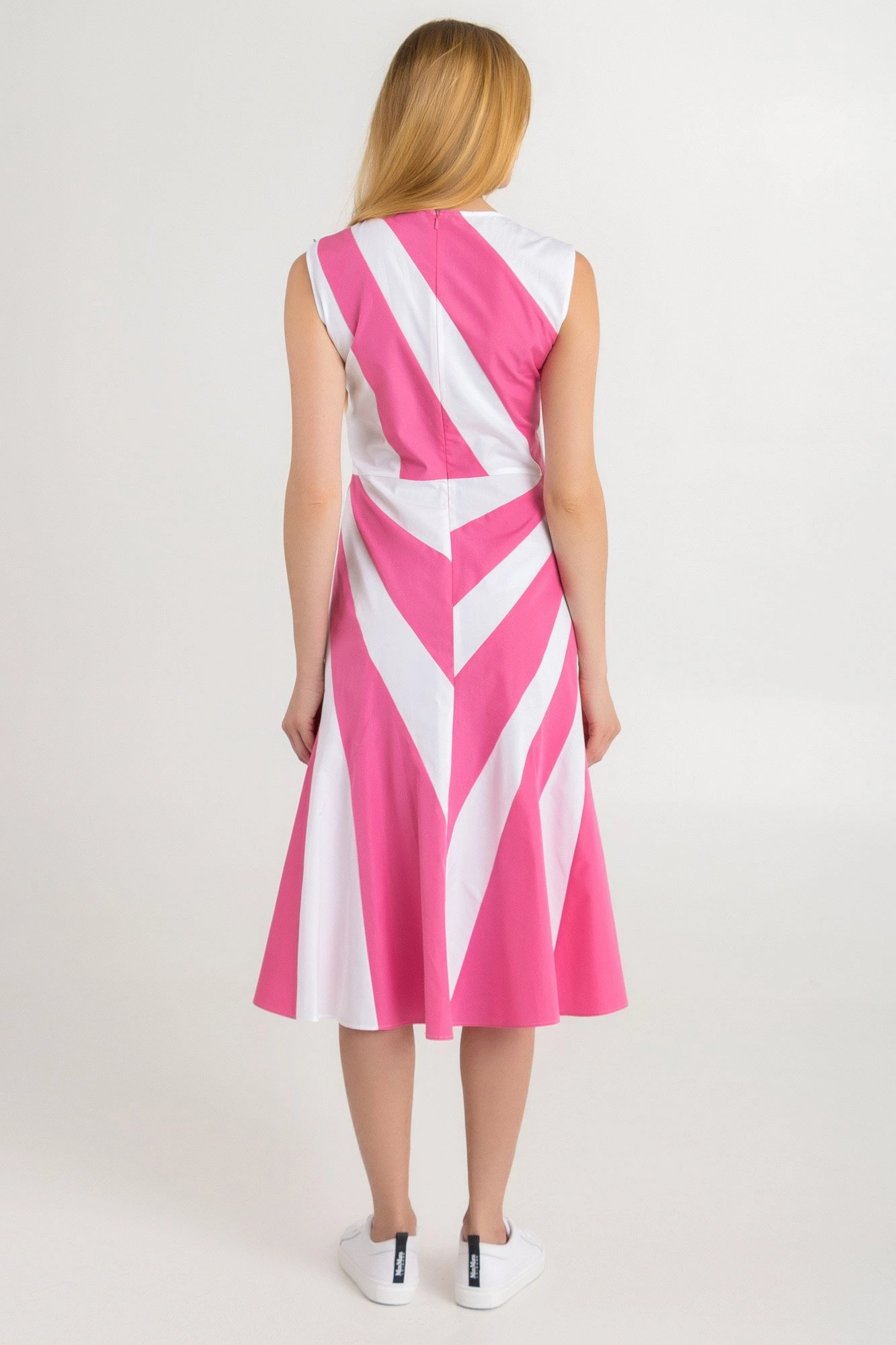 Biało - różowa sukienka w asymetryczne wzory. Dekolt typu o-neck. Zapinana z tyłu na kryty zamek. Szerokie ramiączka. Sukienka rozkloszowana, dzięki czemu jest bardzo kobieca i stylowa zarazem. Wykonana z wysokiej jakości tkaniny. Długość midi.