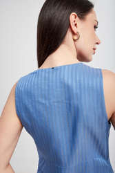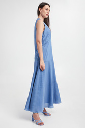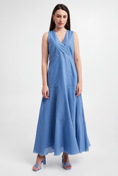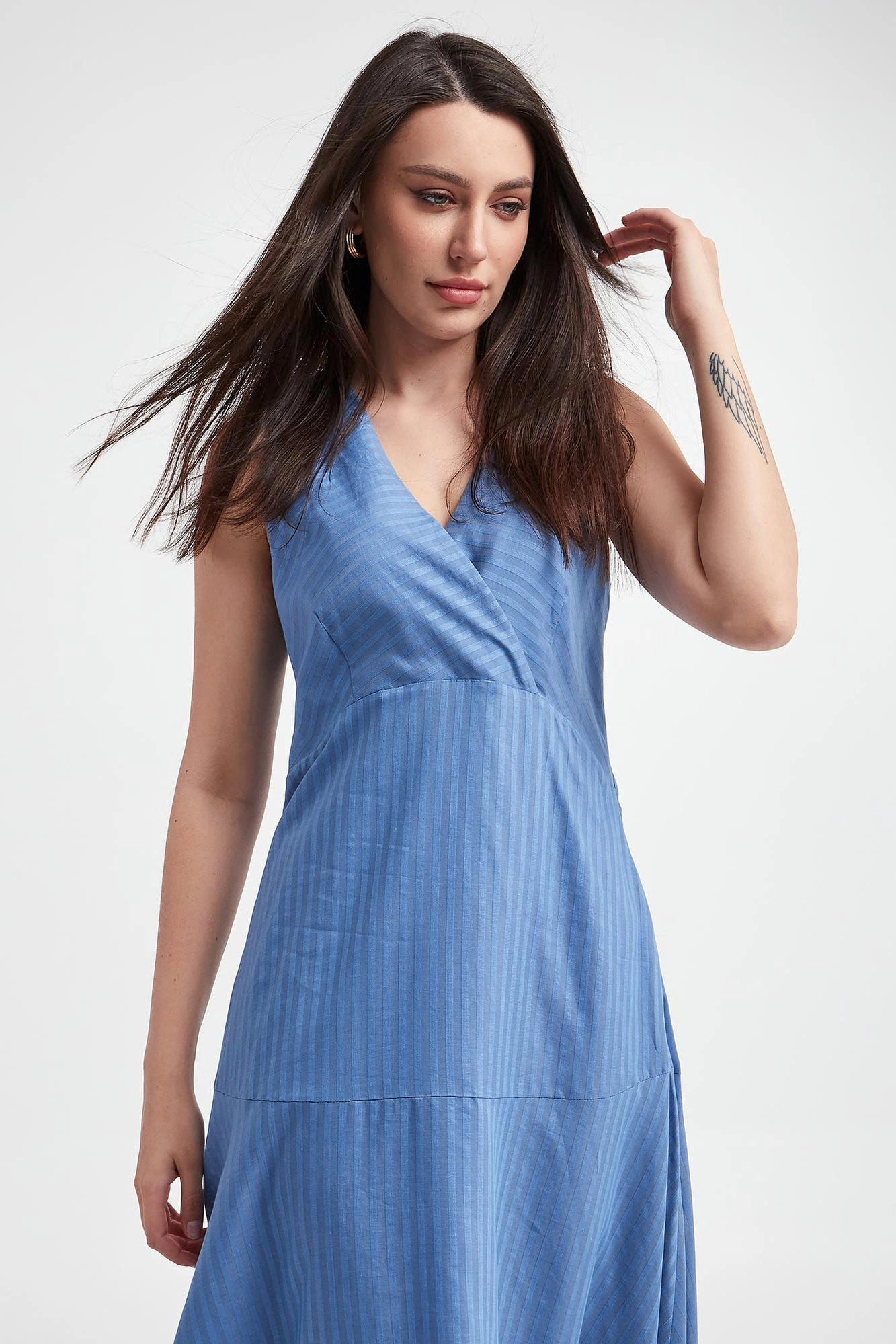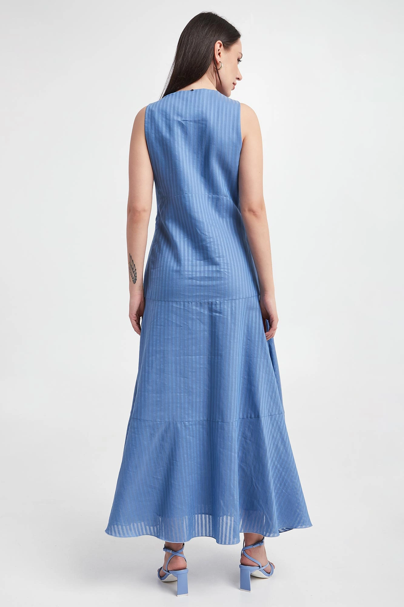 Błękitna, długa sukienka bez rękawów. Na całości wzór w transparentne paski. Dekolt głęboki, kopertowy. Odcinana pod biustem. Sukienka rozszerza się ku dołowi, co powoduje że pięknie układa się w ruchu. Z tyłu, na wysokości karku, doszyty niewielki kryształek - charakterystyczny dla marki. Posiada podszewkę. Zjawiskowa i kobieca. Wykonana z wysokiej jakości bawełny z domieszką jedwabiu i lnu.
