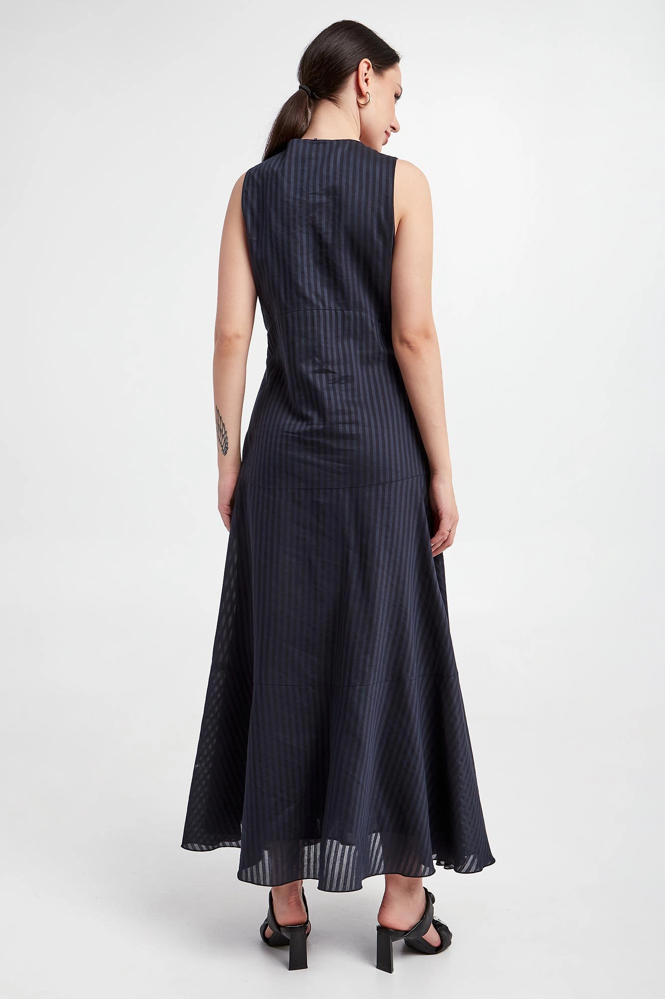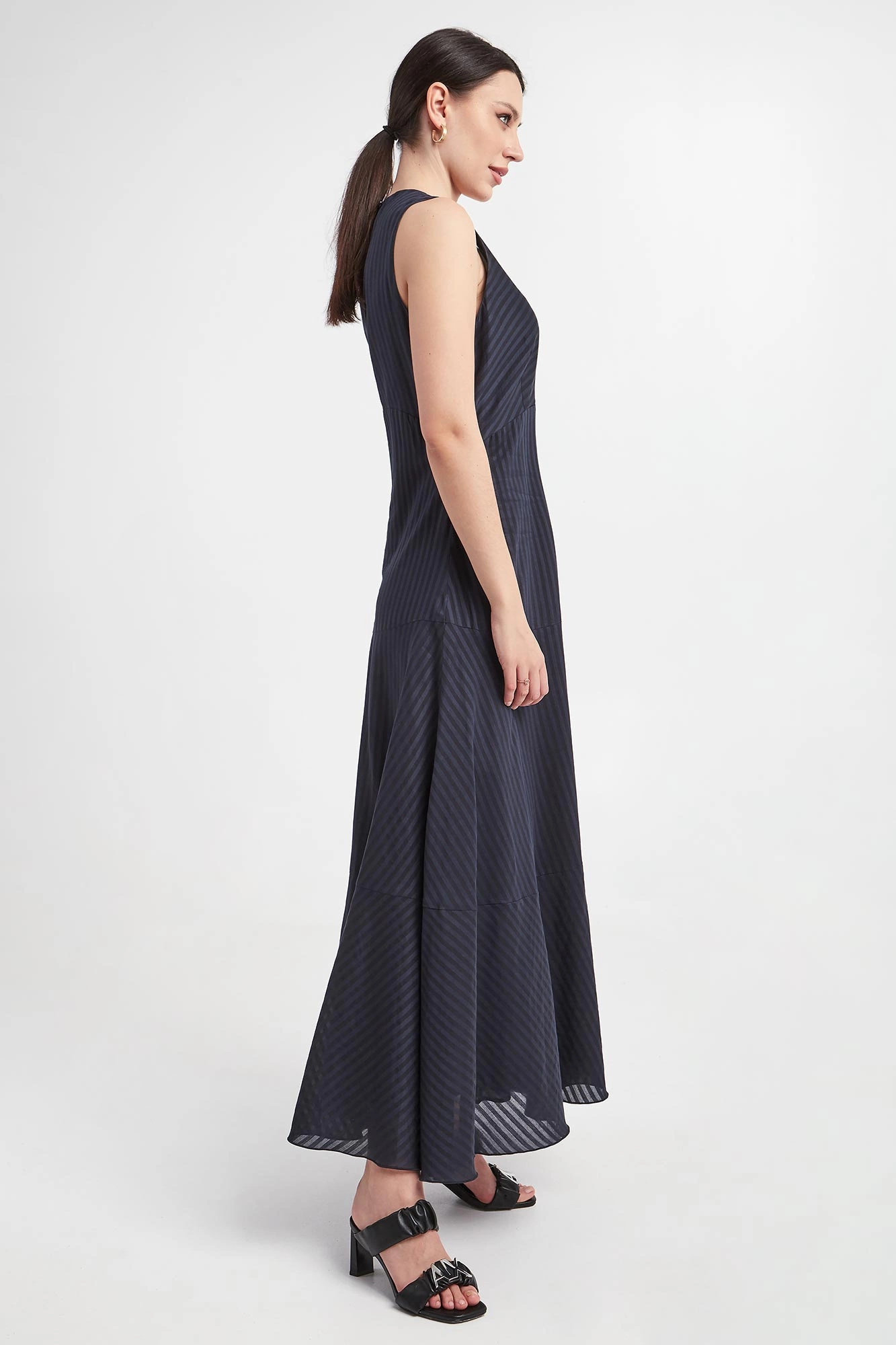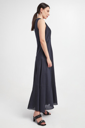 Granatowa sukienka bez rękawów. Długość maxi. Dekolt głęboki, kopertowy. Odcinana pod biustem. Na całości wzór w transparentne paski. Sukienka rozszerza się ku dołowi, co powoduje że pięknie układa się w ruchu. Z tyłu doszyty niewielki kryształek - charakterystyczny dla marki. Posiada podszewkę. Stylowa i kobieca. Wykonana z wysokiej jakości bawełny z domieszką jedwabiu i lnu.