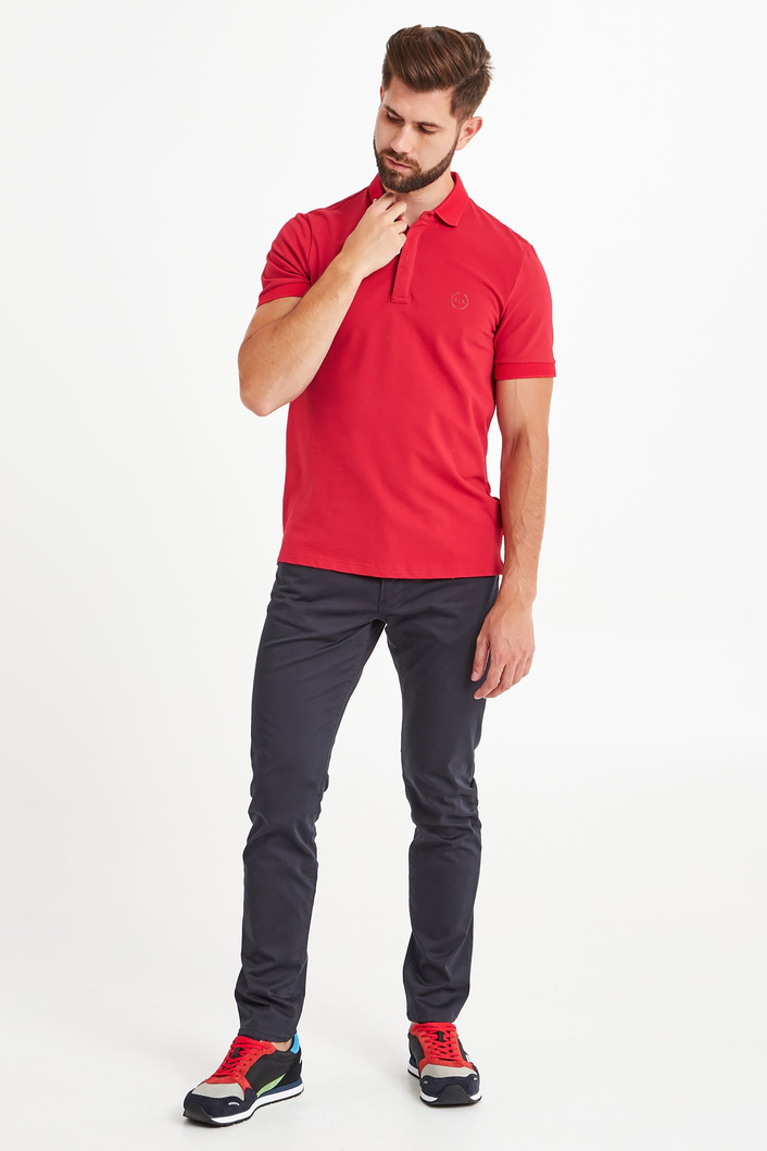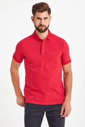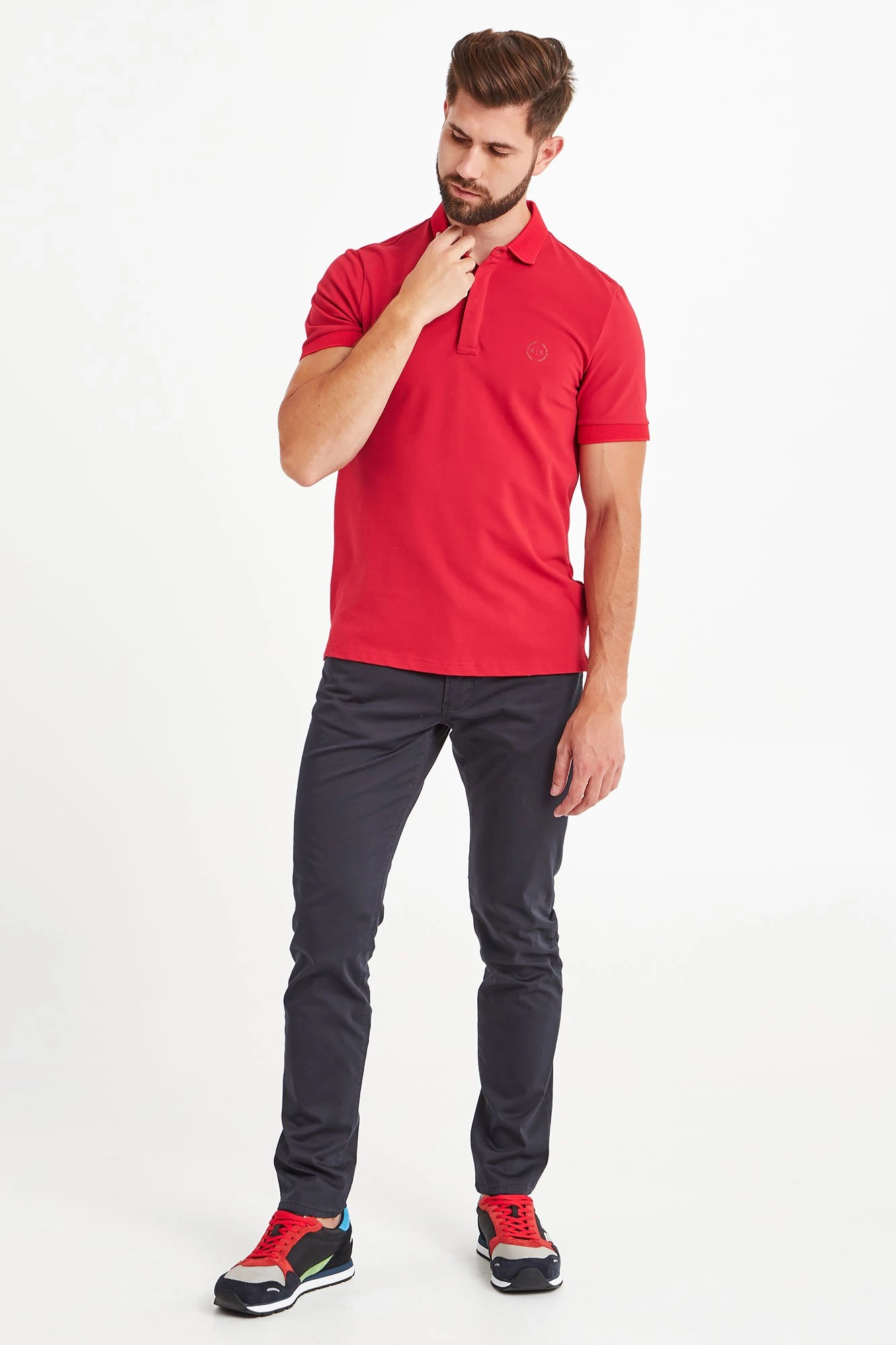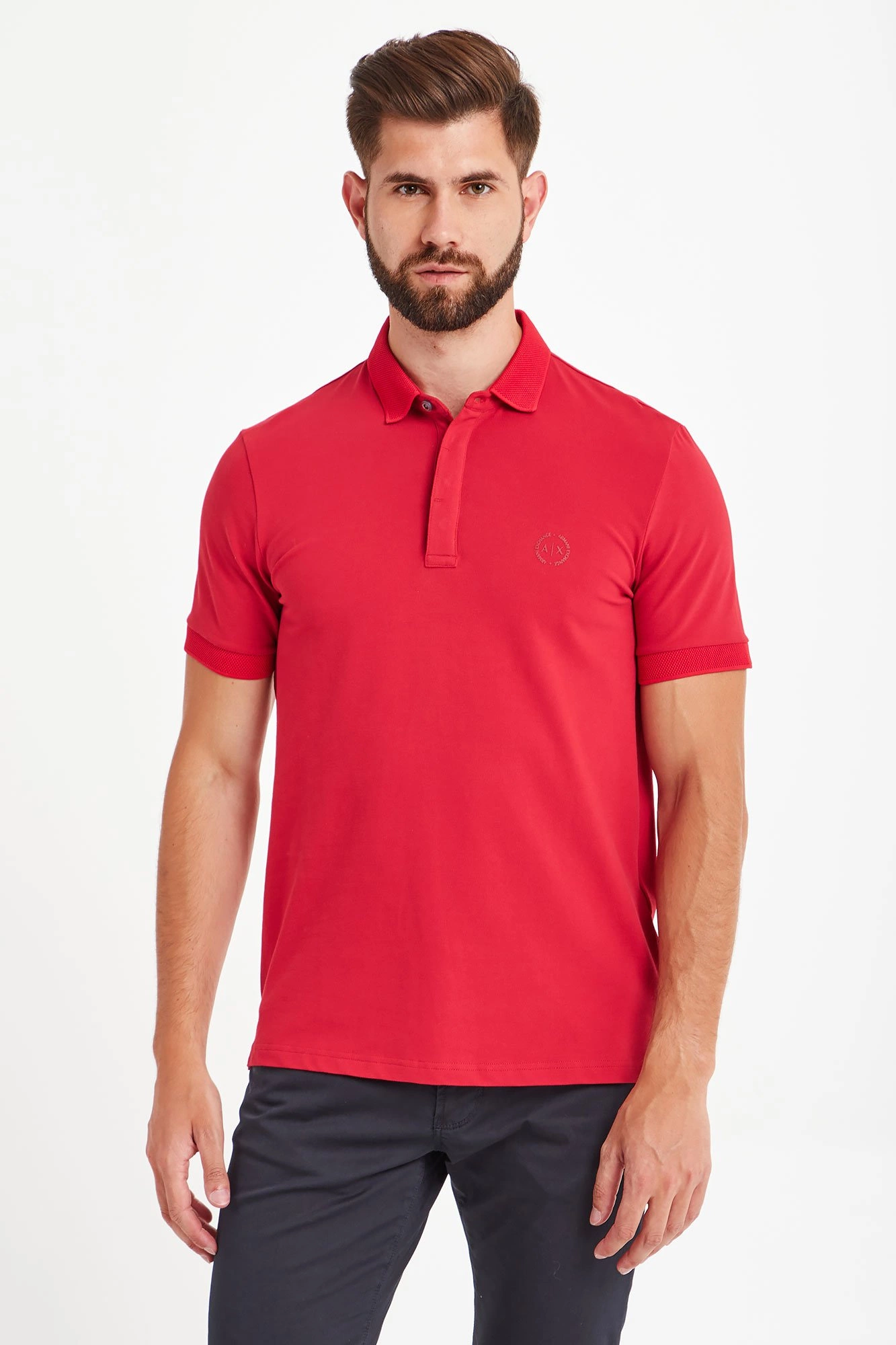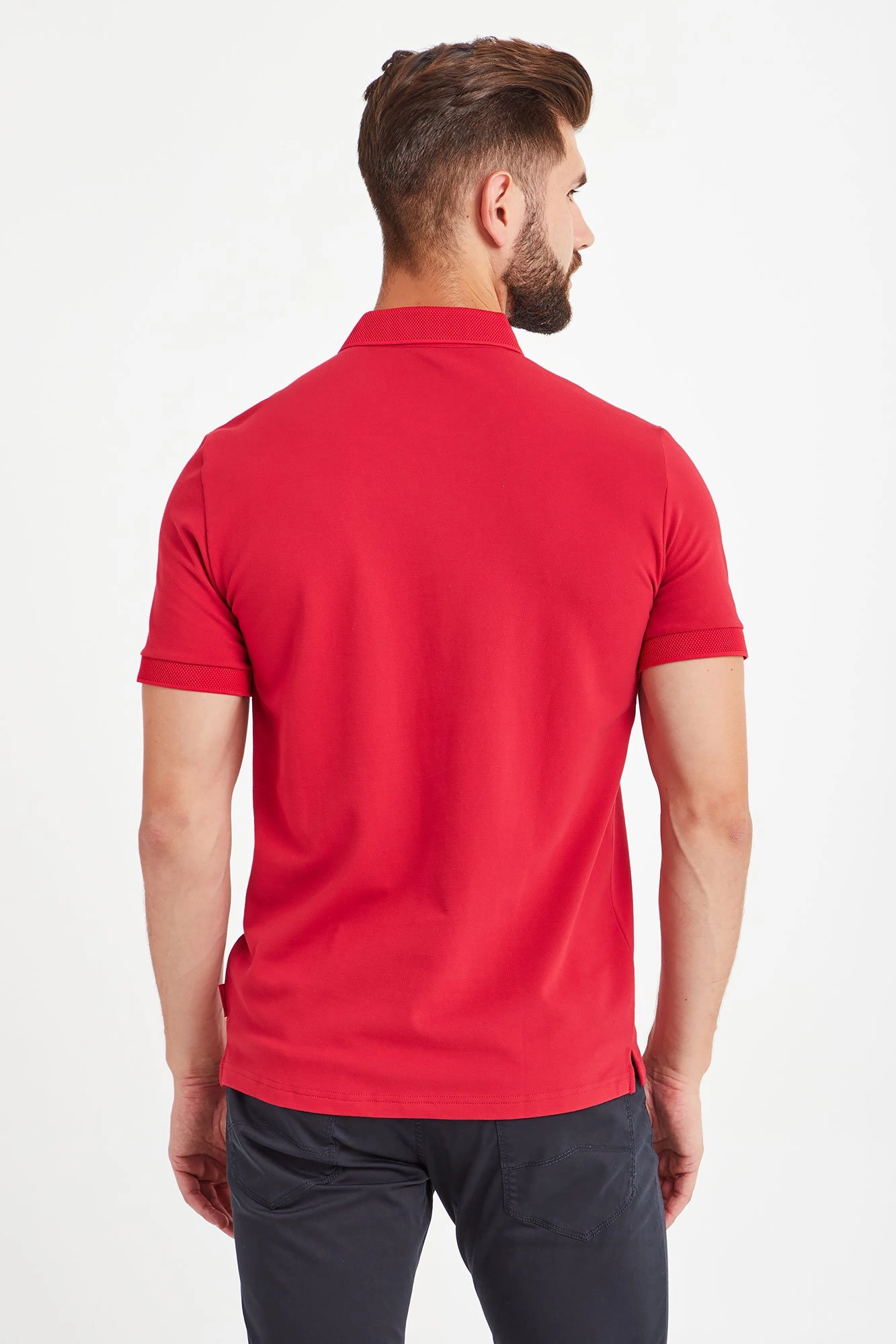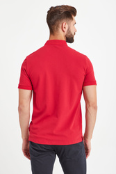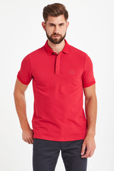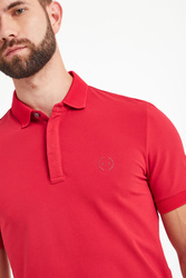 Czerwone polo o prostym fasonie. Zapinane na trzy guziki. Dekolt wykończony kołnierzykiem. Z przodu niewielki nadruk z logo marki. Rękawy wykończone ściągaczem. U dołu rozcięcia. Polo wykonane z najwyższej jakości bawełny z dodatkiem elastanu. Klasyczne i komfortowe. Idealne do stylizacji o lekko sportowym charakterze.