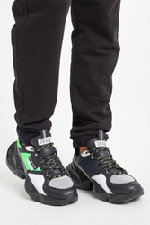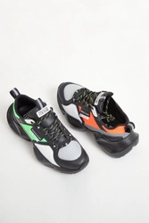 Designerskie, wielokolorowe sneakersy. Na całości srebrne wstawki z innego typu materiału i skóry naturalnej. Z boku aplikacja z nazwą marki. Wiązane na czarno-żółte sznurówki. Na języku biała naszywka, na niej nadruk z logo marki. Bok jednego buta w kolorze neonowej pomarańczy, drugiego w ostrej zieleni. Wnętrze w czarnym kolorze. Masywna, czarna podeszwa o wysokości około 7,5 cm. Bardzo komfortowy model butów, skonstruowany w oparciu o najnowsze trendy.