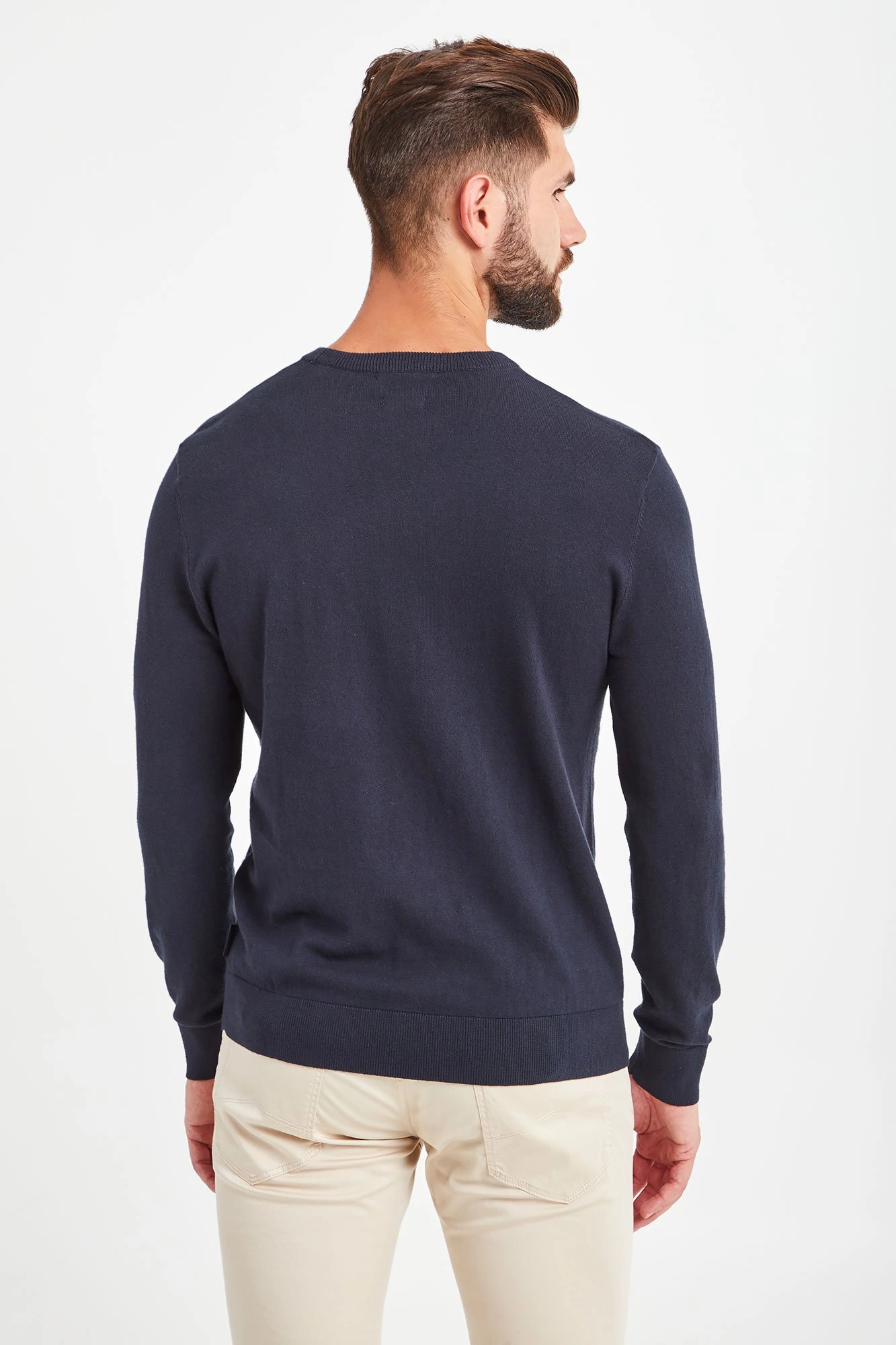 Klasyczny sweter w granatowym kolorze o prostym fasonie. Dekolt typu o-neck wykończony ściągaczem. Z przodu delikatnie tłoczony wzór z logo i nazwą marki. Rękawy i dół wykończone ściągaczem. Z boku niewielka wszywka z nazwą marki. Wykonany z najwyższej jakości bawełny z dodatkiem kaszmiru. Ciepły i komfortowy. Idealny na chłodniejsze dni.