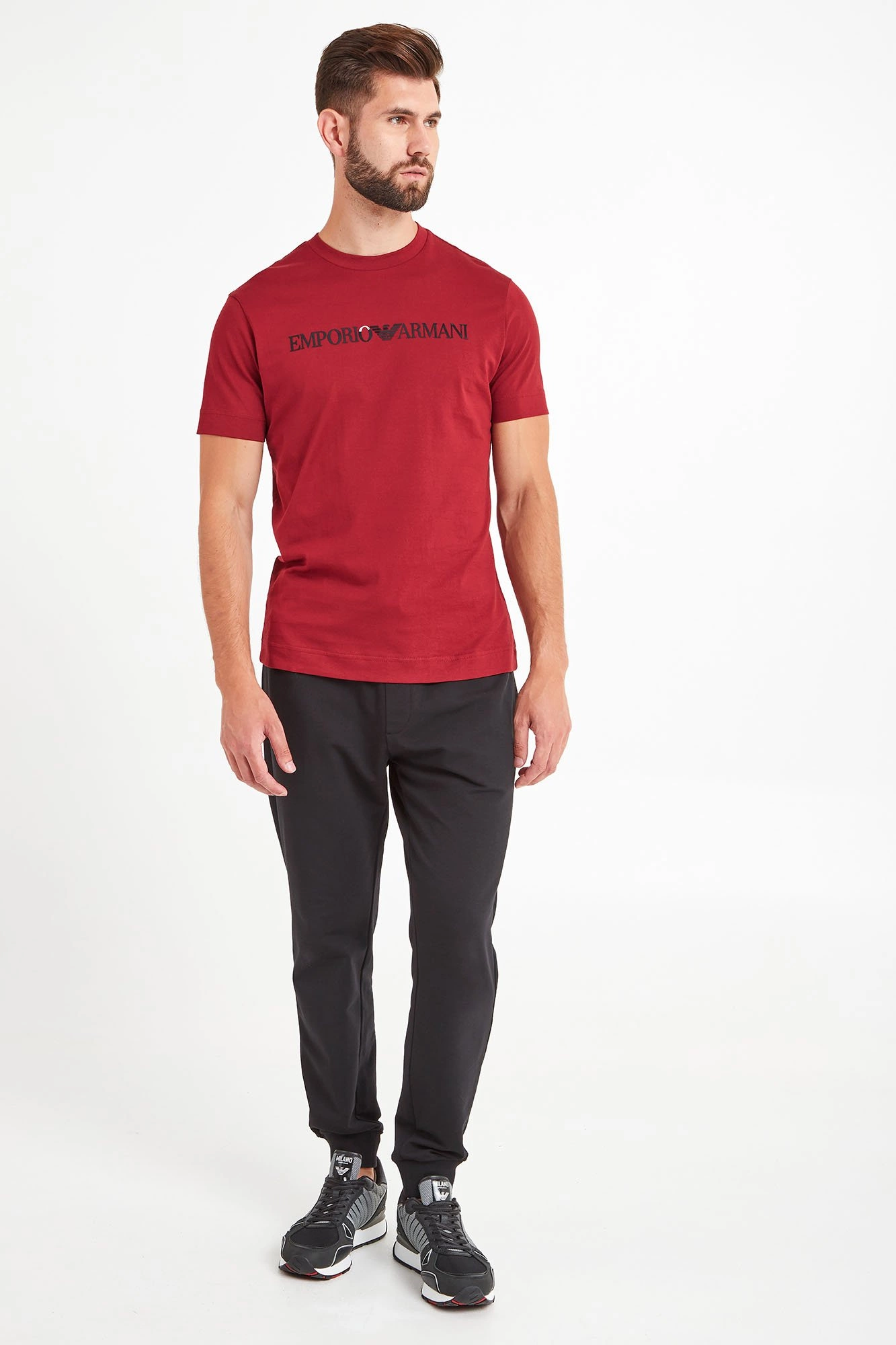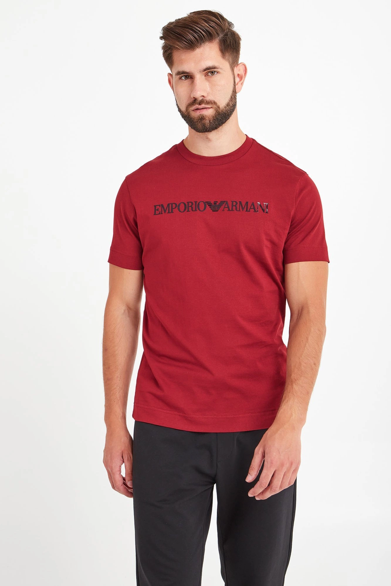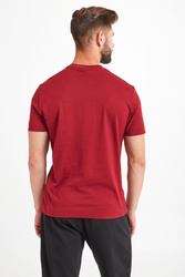 Klasyczny t-shirt w bordowym kolorze. Fason prosty. Z przodu duży, połyskujący nadruk z logo i nazwą marki. Dekolt wykończony ściągaczem. T-shirt wykonany z niezwykle miękkiej w dotyku bawełny. Wygodny i lekko elastyczny. Idealny jako baza codziennych stylizacji.