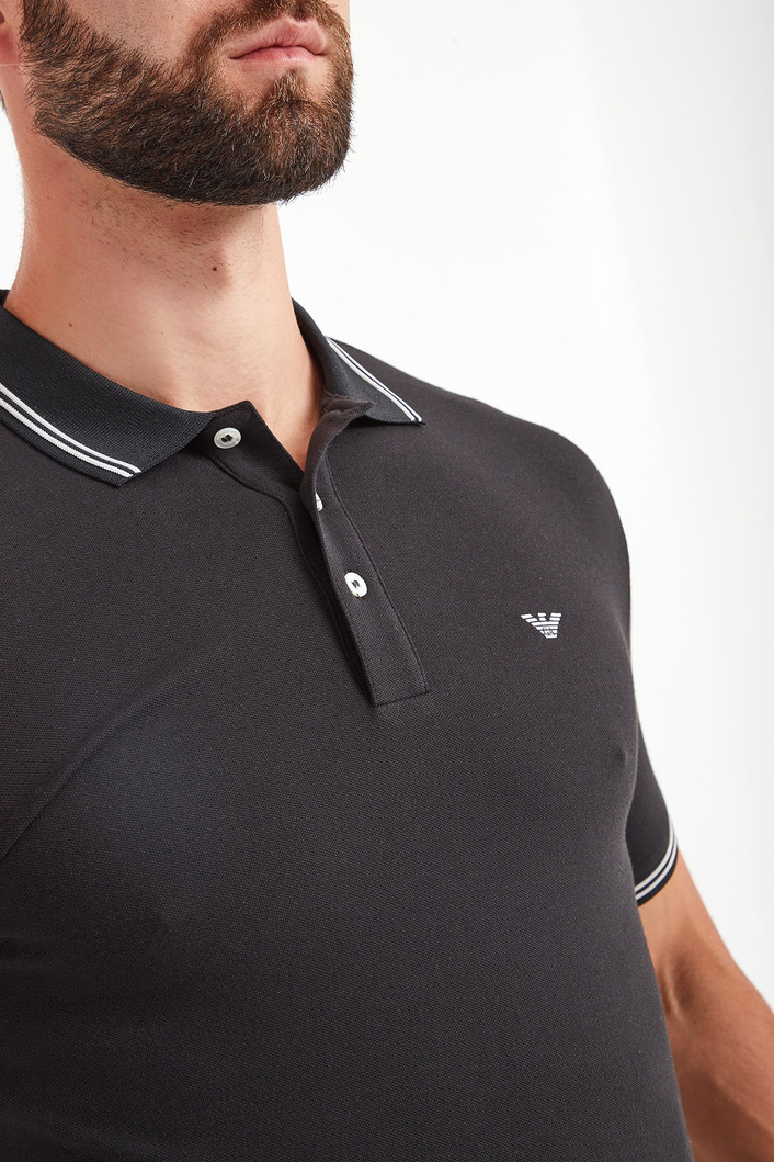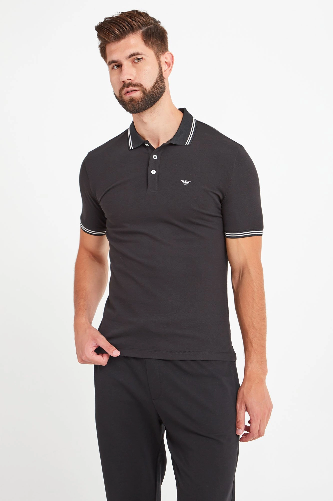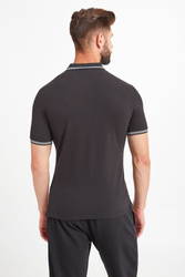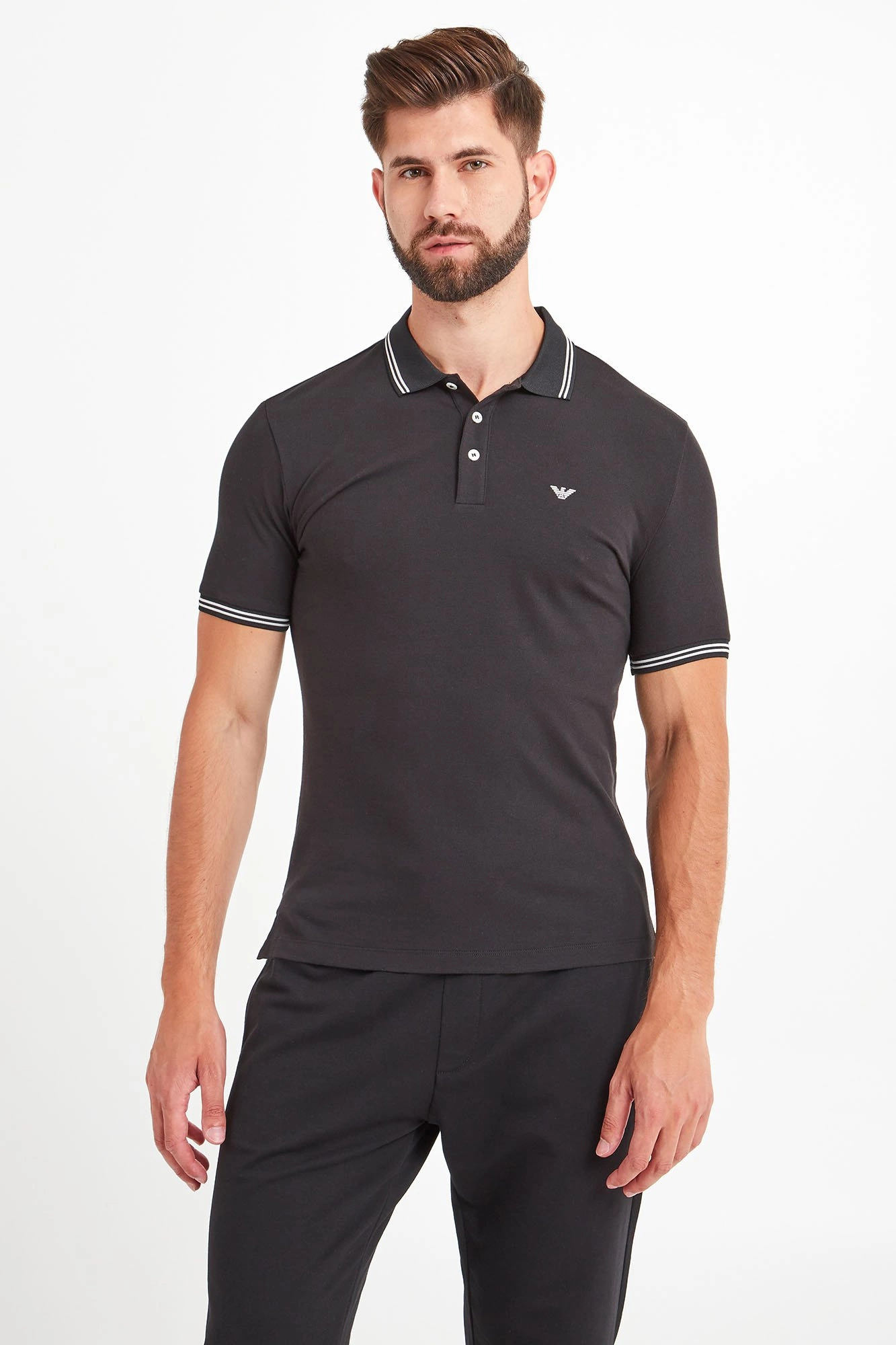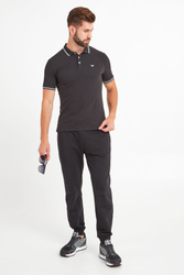Czarne polo o prostym fasonie. Zapinane na perłowe guziki sygnowane logo marki. Na kołnierzyku i rękawach białe paski. Z przodu niewielki, kontrastowy nadruk z logo marki. Dół asymetryczny z rozcięciami po bokach. Polo wykonane z najwyższej jakości bawełny z dodatkiem elastanu. Doskonałe połączenie wygody ze stylowym, włoskim wzornictwem.