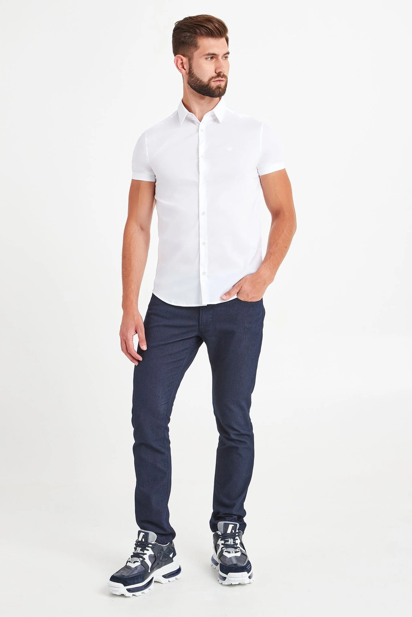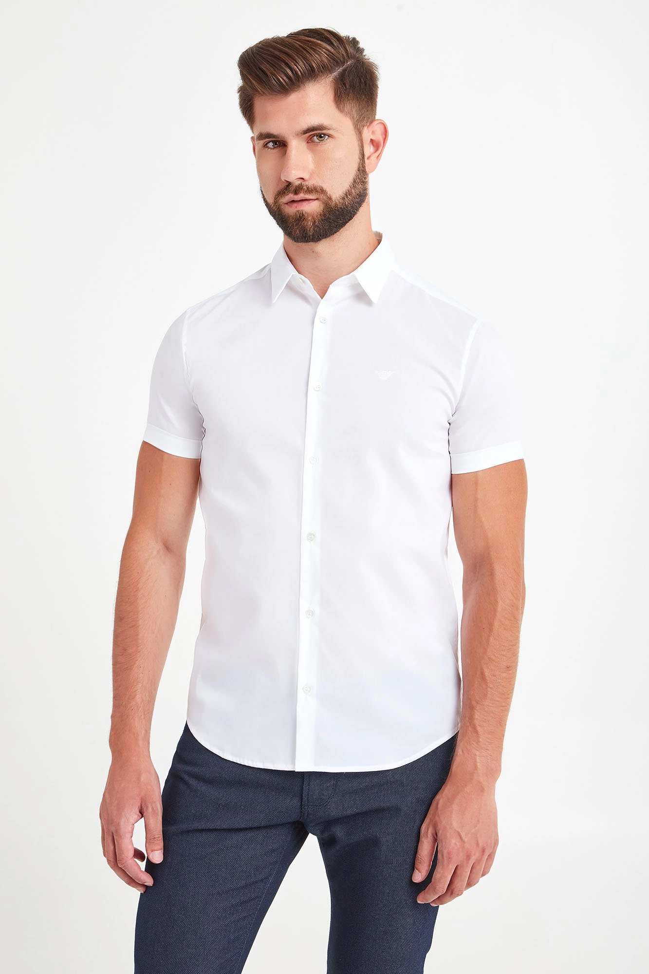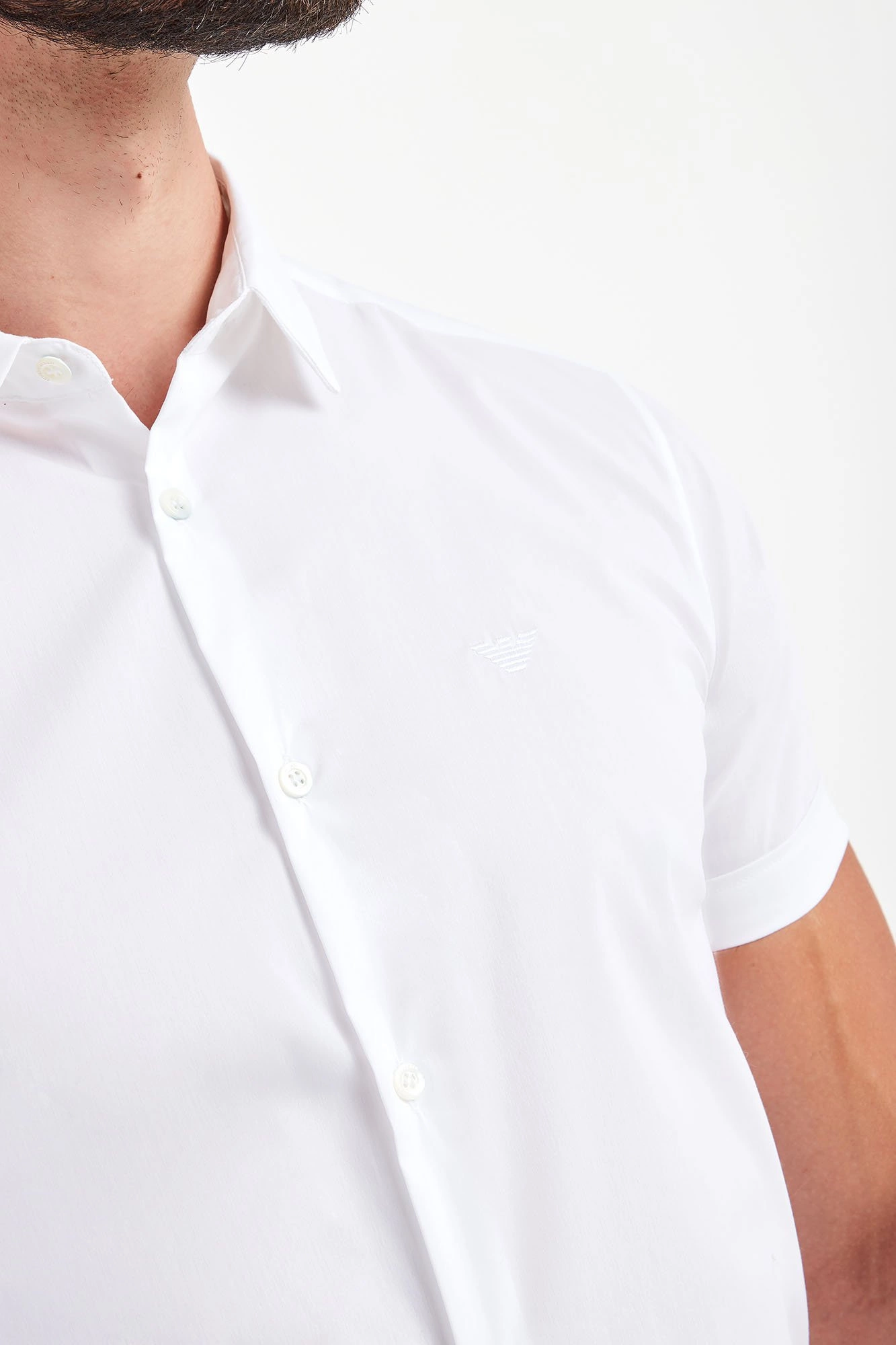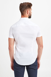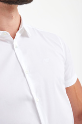 Koszula z krótkim rękawem w białym kolorze. Fason slim fit. Kołnierzyk typu Kent. Zapinana na perłowe guziki sygnowane logo marki. Z przodu niewielki haft z logo marki. Dół lekko asymetryczny. Bardzo lekka i komfortowa. Połączenie wysokiej jakości tkanin z unikatowym, włoskim wzornictwem.