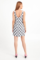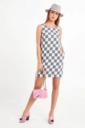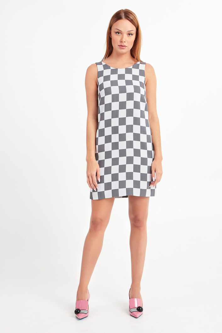 Lekka sukienka w szarym kolorze. Na całości biało-szara kratka. Zapinana z tyłu na kryty zamek i haftkę. Po bokach dwie kieszenie. Podszewka gładka, w szarym kolorze. Długość mini. Wykonana z najwyższej jakości materiałów. Lekka, delikatna i bardzo kobieca.
