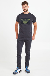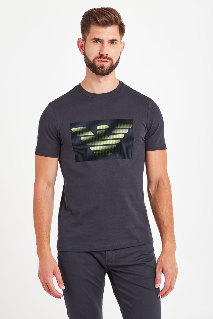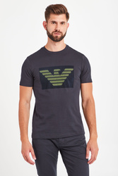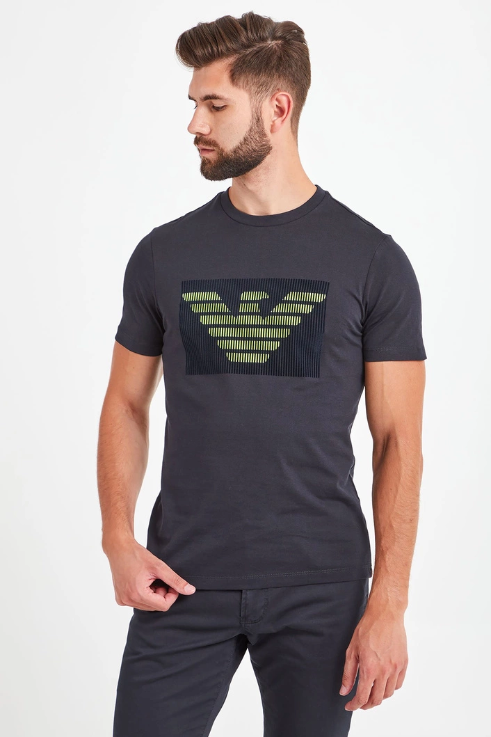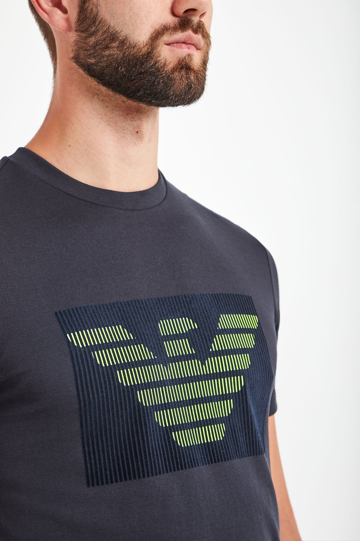Klasyczny, ciemnogranatowy t-shirt o prostym fasonie. Dekolt typu o-neck wykończony ściągaczem. Z przodu duża, limonkowa aplikacja z logo marki. Wykonany z najwyższej jakości bawełny. Ponadczasowy, przewiewny i wygodny.