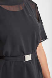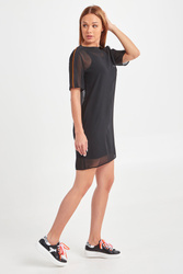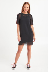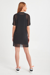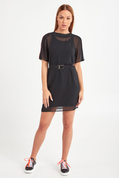 Oryginalna sukienka w czarnym kolorze. Dekolt typu o-neck wykończony szerokim ściągaczem. Dwuwarstwowa: spód dopasowany, na szerokich ramiączkach, wierzch wykonany z lekko transparentnej siatki z krótkim rękawem. Z przodu niewielkie logo marki. W talii elastyczny pasek, z dużą logowana klamrą. Długość mini. Sukienka wykonana z najwyższej jakości materiałów. Stylowa propozycja na wieczór.
