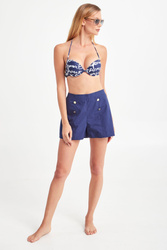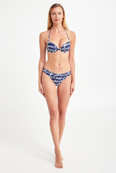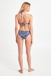 Dwuczęściowy strój kąpielowy w granatowym kolorze. Na całości biały wzór z nazwą marki. Miseczki lekko usztywnione. Wykonany z najwyższej jakości szybkoschnącego materiału. Komfortowy i stylowy.