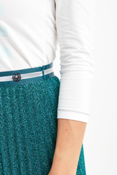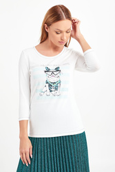 Finezyjna bluzka w białym kolorze o prostym fasonie. Z przodu duży kolorowy nadruk. Dekolt typu o-neck. U dołu i na rękawach srebrny, lekko połyskujący haft. Z tyłu, na wysokości karku niewielka, logowana blaszka. Bluzka wykonana z najwyższej jakości materiału. Bardzo wygodna i kobieca.