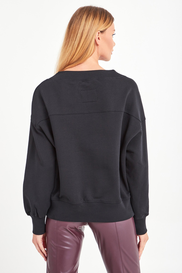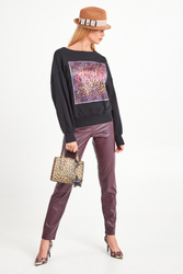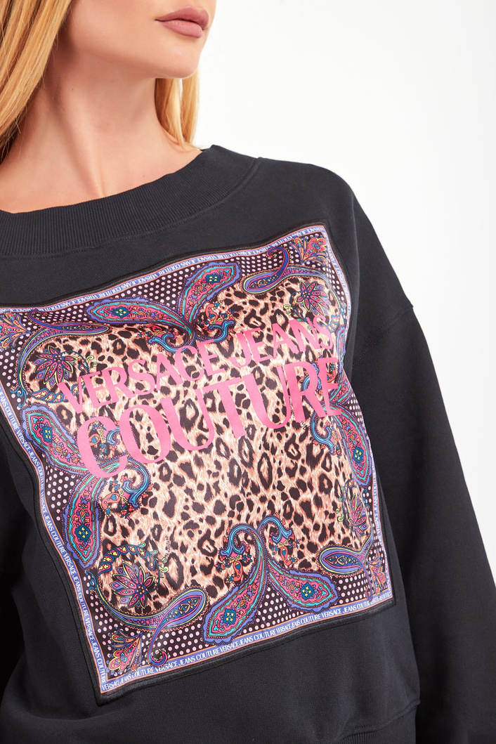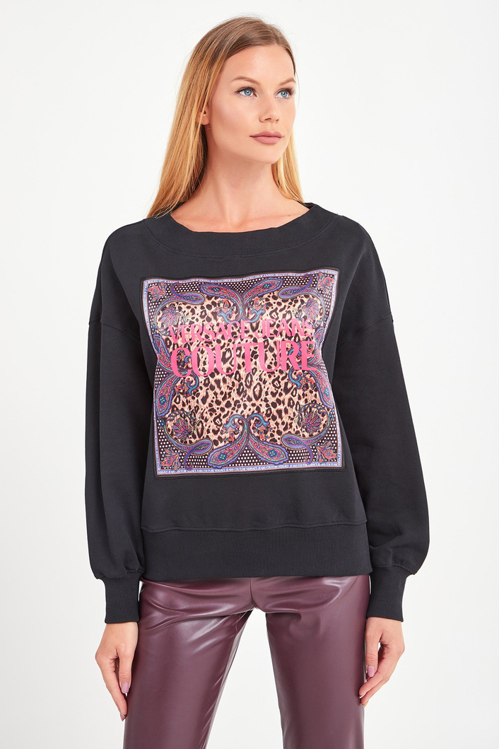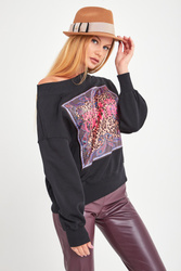 Designerska bluza w czarnym kolorze. Fason nieco luźniejszy. Dekolt typu o-neck wykończony ściągaczem. Z przodu duża, kolorowa aplikacja ze zwierzęcym printem i motywem Paisley. Na niej nadruk z nazwą marki. Rękawy i dół wykończone szerokim ściągaczem. Wykonana z najwyższej jakości bawełny. Niesamowite połączenie komfortu i włoskiego designu.