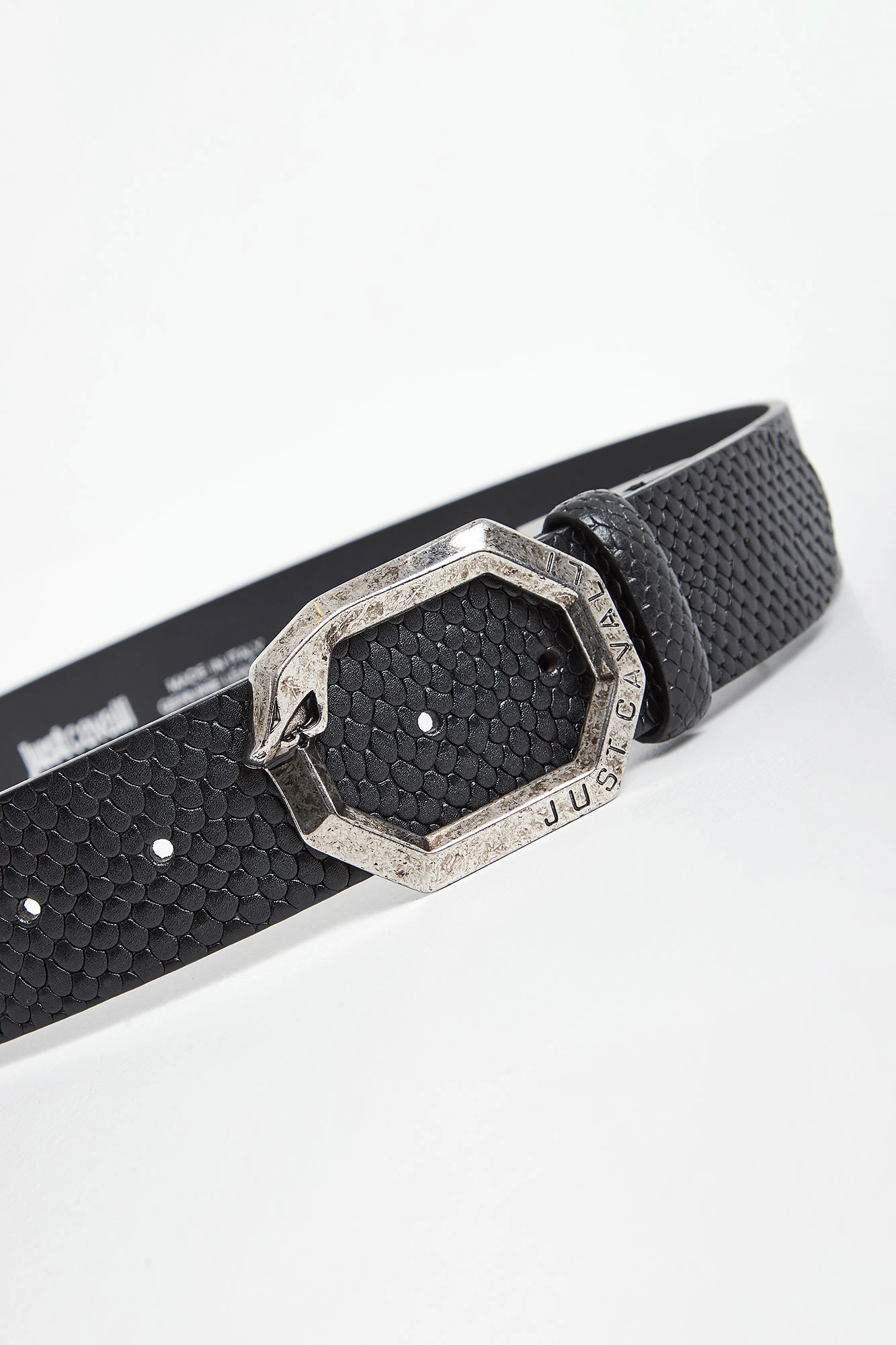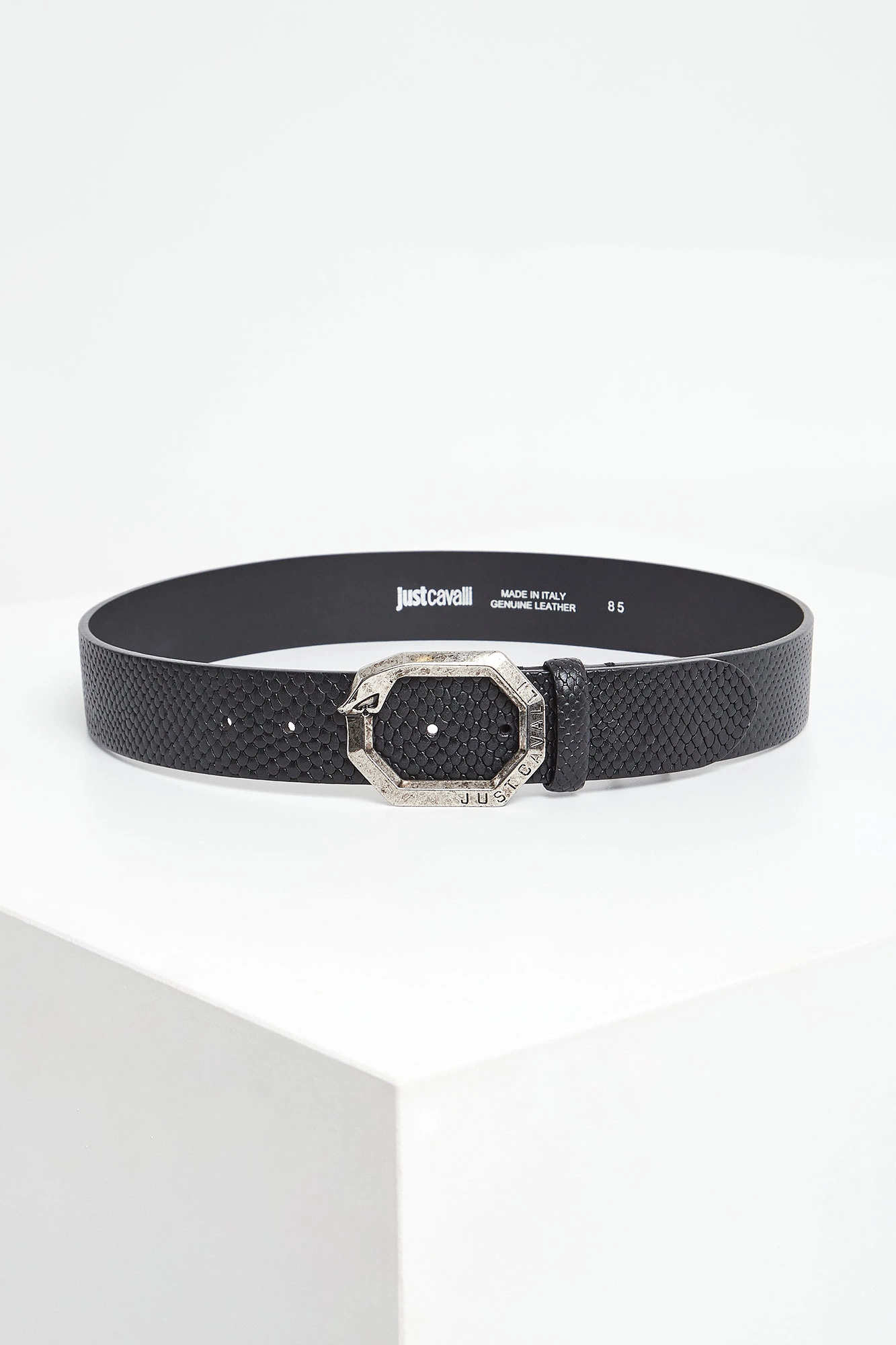 Skórzany pasek marki Just Cavalli w czarnym kolorze. Wykonany z naturalnej skóry cielęcej. Na całości widoczna struktura zwierzęcej skóry. Zapinany na dużą metalową klamrę z bolcem i tłoczoną nazwą marki w srebrnym kolorze. Klamra z efektem postarzenia tworząca sylwetkę węża.