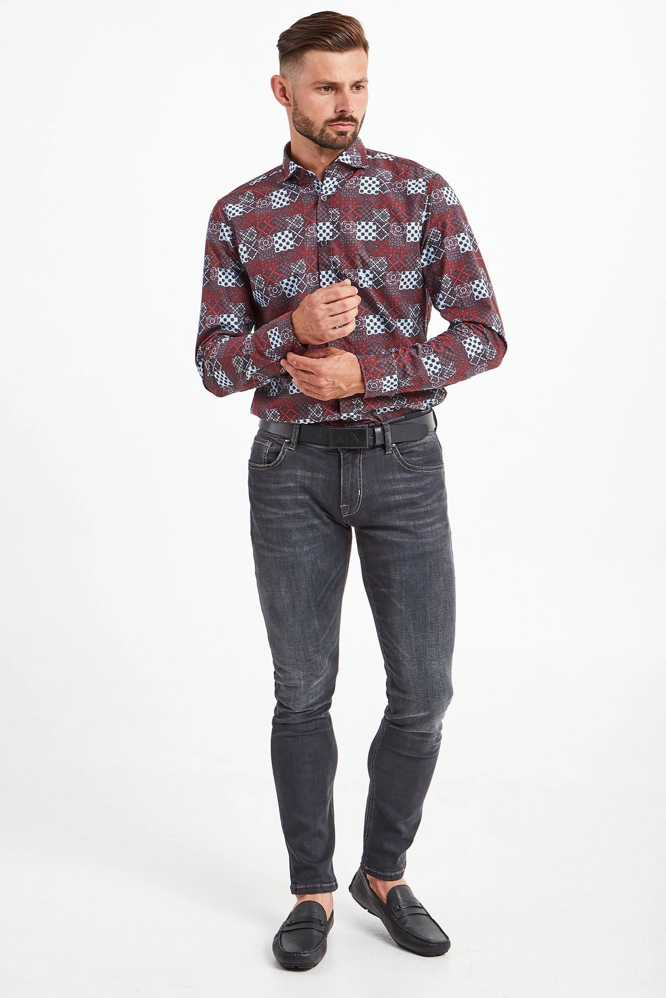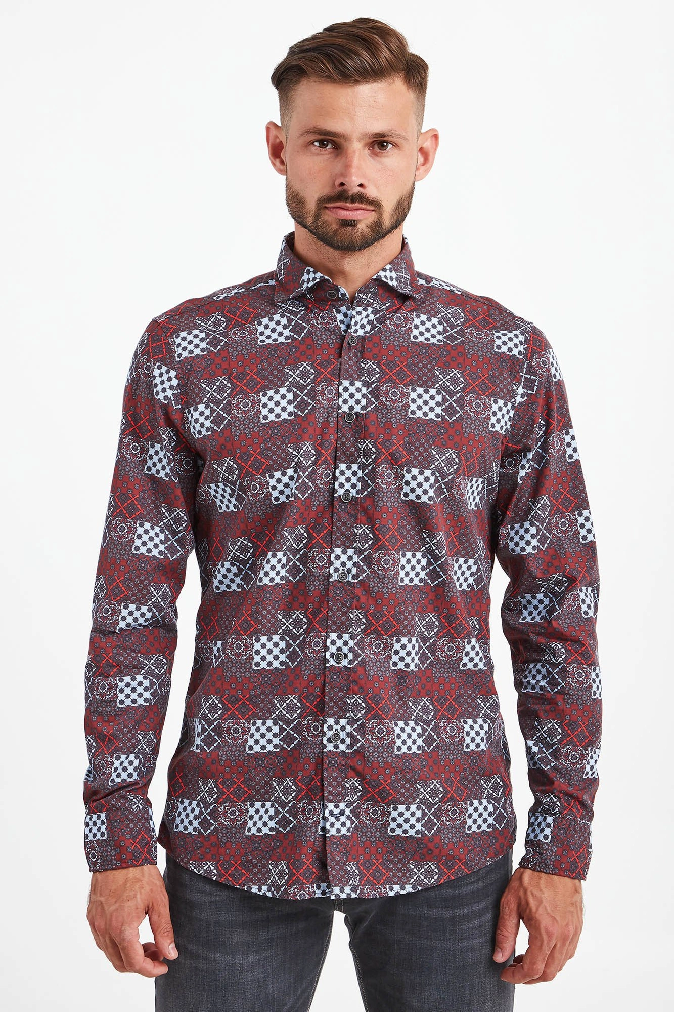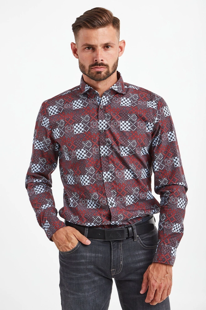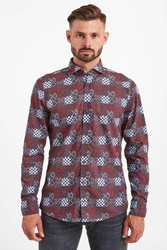 Wielokolorowa koszula o prostym fasonie. Na całości wzór w stylu retro. Kołnierz typu włoskiego. Rękawy wykończone mankietami zapinanymi na jeden guzik. U dołu, po bokach aplikacja z nazwą marki. Koszula wykonana z najwyższej jakości, lekkiej i przewiewnej bawełny. Elegancka i efektowna.