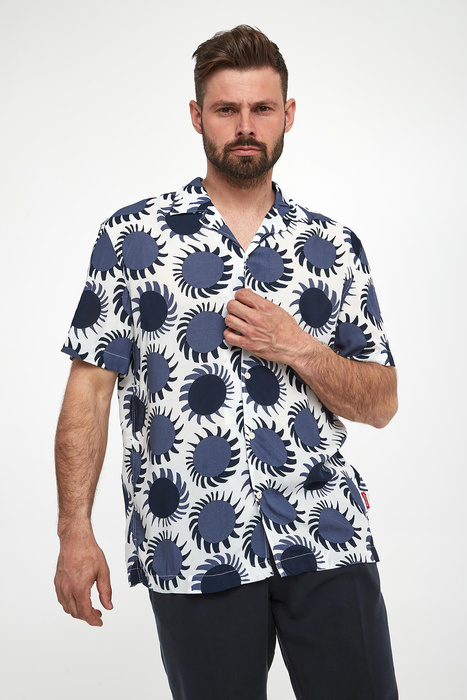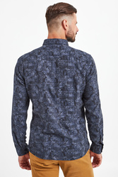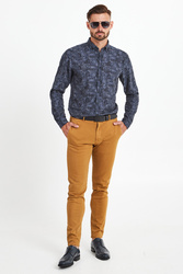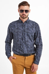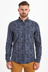 Klasyczna koszula w granatowym kolorze. Fason slim fit. Na całości ciemniejszy wzór z nazwą marki. Kołnierz typu button-down. Rękawy wykończone mankietem zapinanym na jeden guzik. Koszula wykonana z najwyższej jakości lekkiej i przewiewnej bawełny. Idealna do codziennych stylizacji.