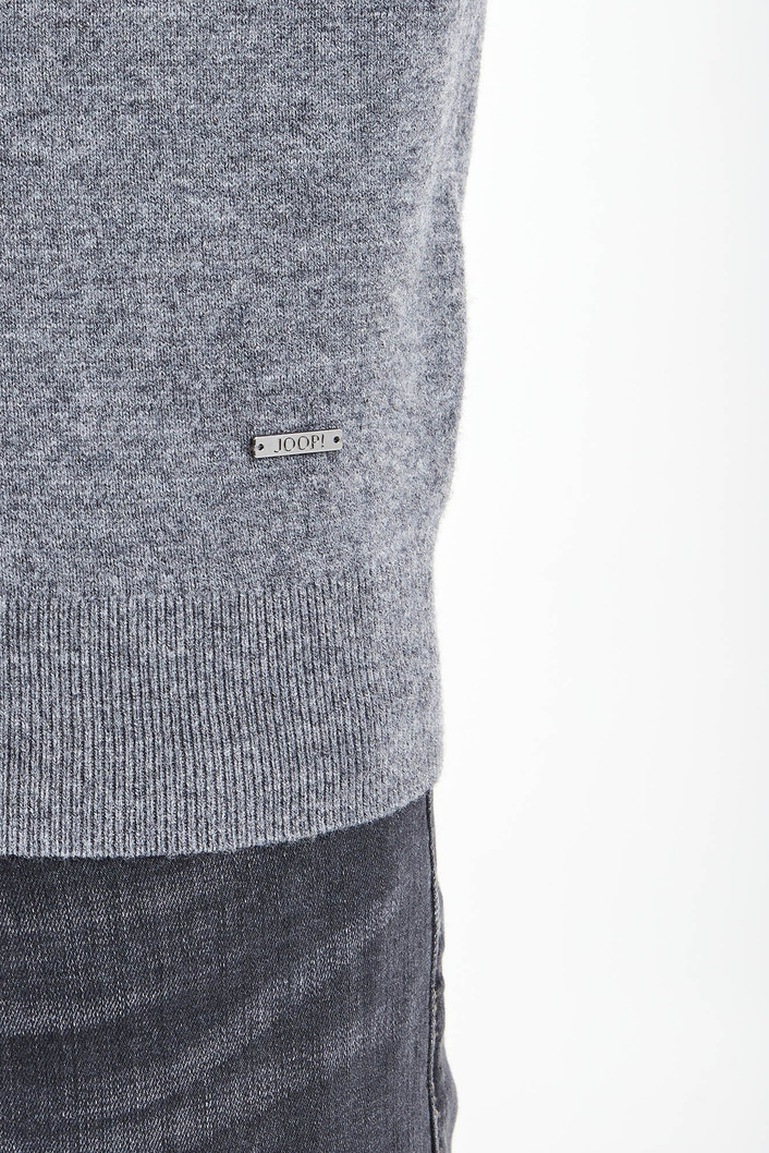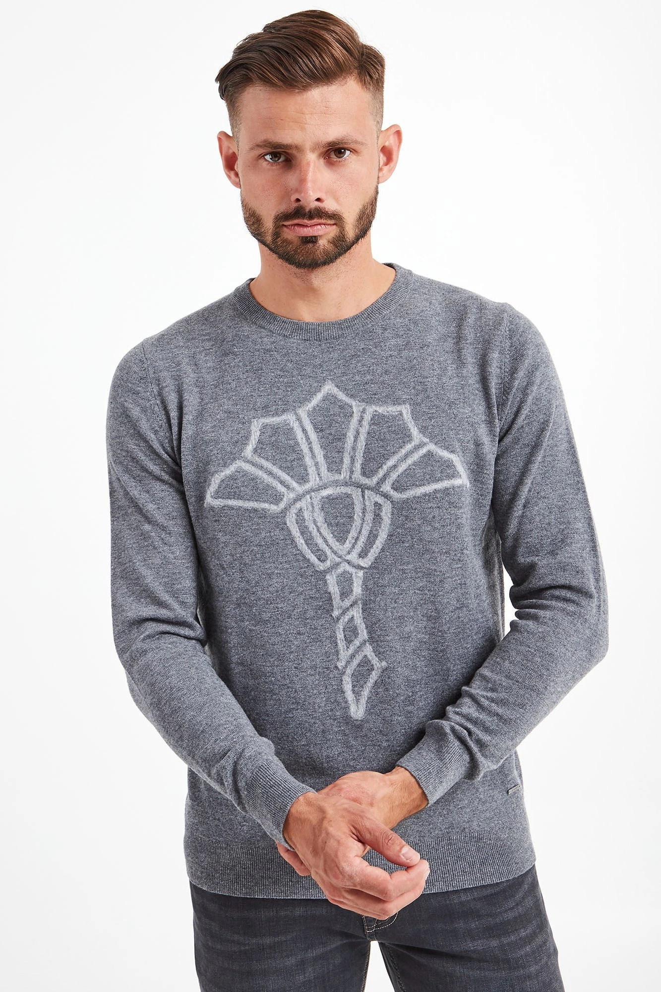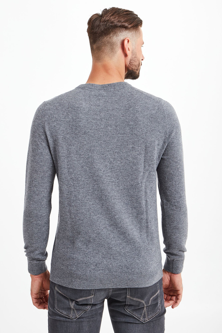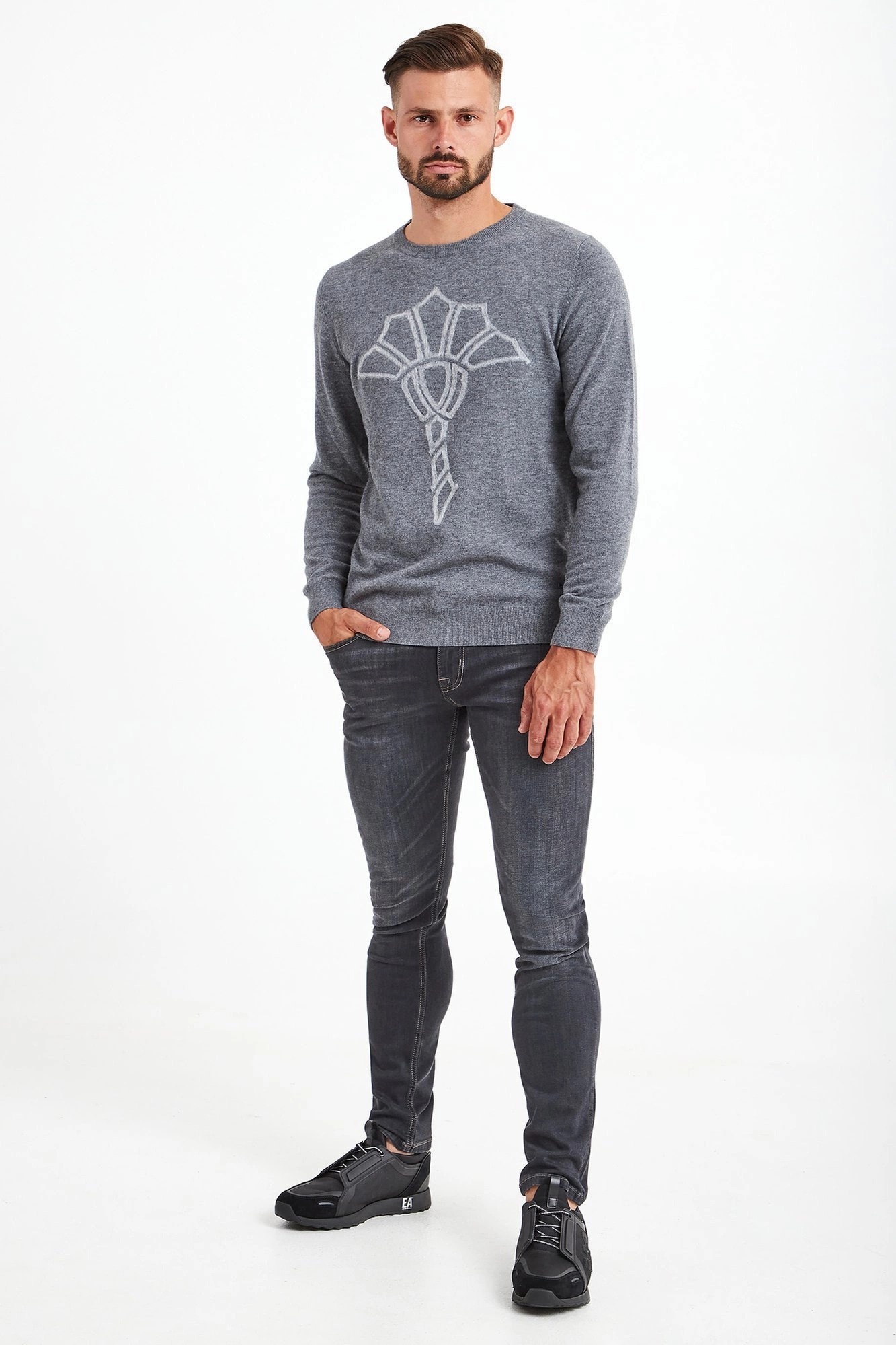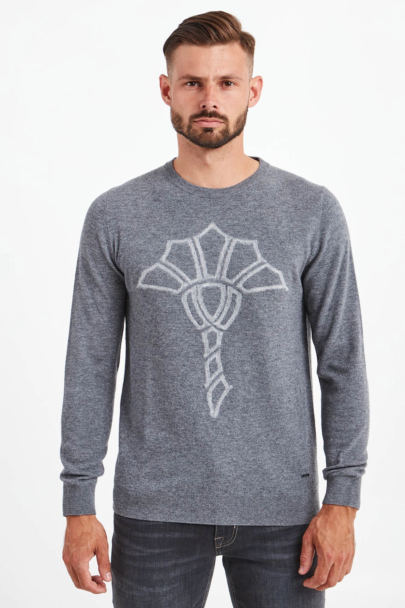 Klasyczny sweter w szarym kolorze. Fason prosty. Dekolt typu o-neck wykończony ściągaczem. Z przodu duże, jasnoszare logo marki. U dołu niewielka, metalowa blaszka z nazwą. Rękawy i dół wykończone ściągaczem. Sweter wykonany z najwyższej jakości dzianiny z dodatkiem wełny. Ciepły i bardzo wygodny.