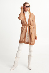 Oryginalny kardigan w odcieniach złota i kremu. Na całości duży, ozdobny splot. Brzegi i rękawy wykończone ściągaczem. W talii wiązany pasek. Kardigan wykonany z najwyższej jakości dzianiny z dodatkiem moheru. Bardzo kobiecy, ciepły i komfortowy.