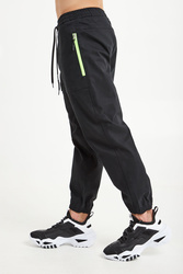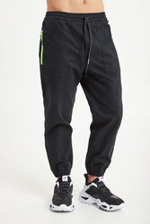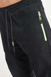 Spodnie dresowe w kolorze czarnym. Po bokach dwie kieszenie zapinane na zamki w kolorze neonowej zieleni. Pas regulowany za pomocą troczków. Nogawki zakończone ściągaczem. Spodnie wykonane z najwyższej jakości bawełny z dodatkiem elastanu. Niezwykle komfortowe i wygodne.