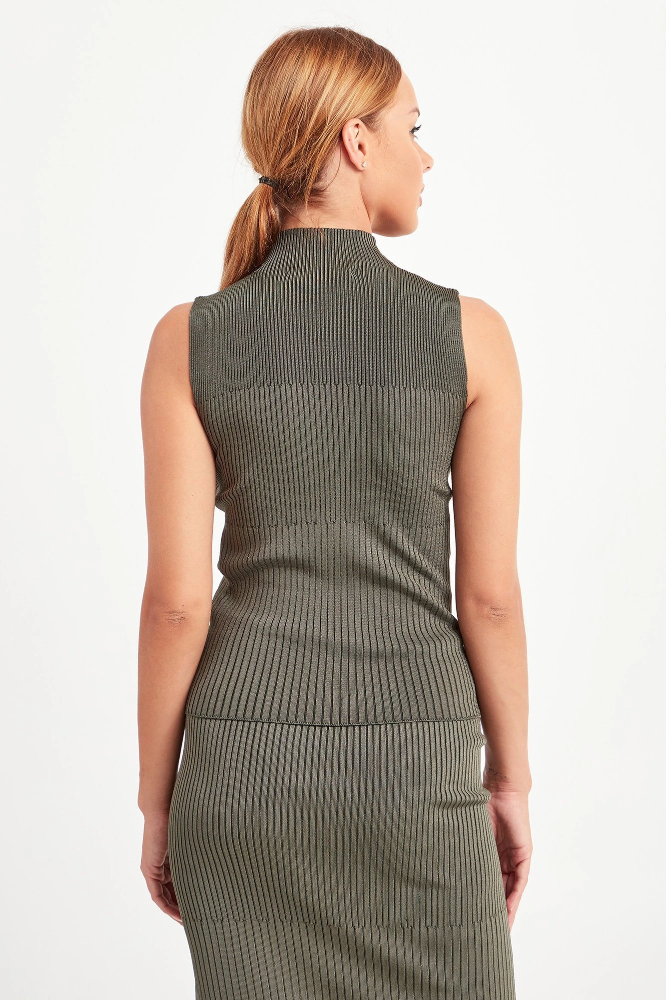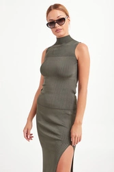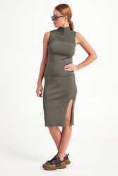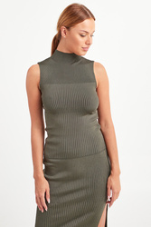 Dopasowany sweter w oliwkowym kolorze. Na całości delikatne prążki. Dekolt wykończony półgolfem. Sweter wykonany z najwyższej jakości, niezwykle elastycznego materiału. Bardzo kobiecy i wygodny.