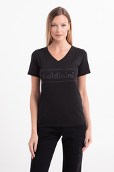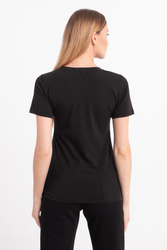 Klasyczny t-shirt w czarnym kolorze. Fason slim fit. Dekolt typu o-neck wykończony ściągaczem. Z przodu duży połyskujący nadruk z nazwą marki w czarnym kolorze. T-shirt wykonany z wysokiej jakości bawełny z dodatkiem elastanu. Wygodny i delikatnie elastyczny.