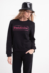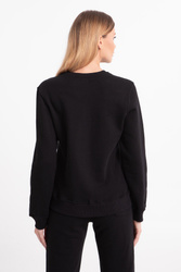 Bluza w czarnym kolorze o delikatnie luźniejszym fasonie. Dekolt typu o-neck. Z przodu duży brokatowy nadruk nazwy marki w różowym kolorze. Dekolt, rękawy i dół wykończone ściągaczem. Bluza wykonana z wysokiej jakości bawełny. Wygodna i przyjemna w dotyku.
