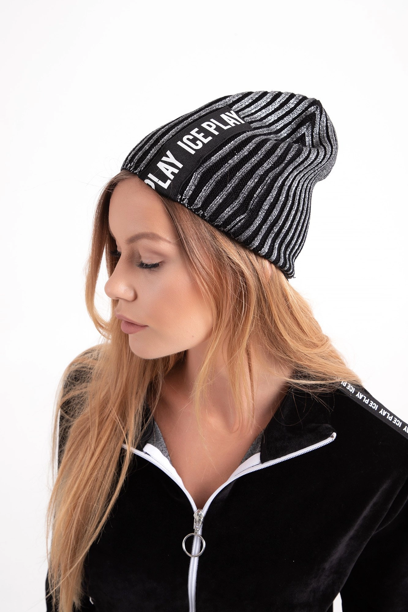 Stylowa czapka typu "beanie". Na całości srebrne paski na czarnym tle. Z przodu wstawka z nazwą marki. Czapka wykonana z najwyższej jakości materiału z wełną. Miękka, komfortowa i przyjemna w dotyku.