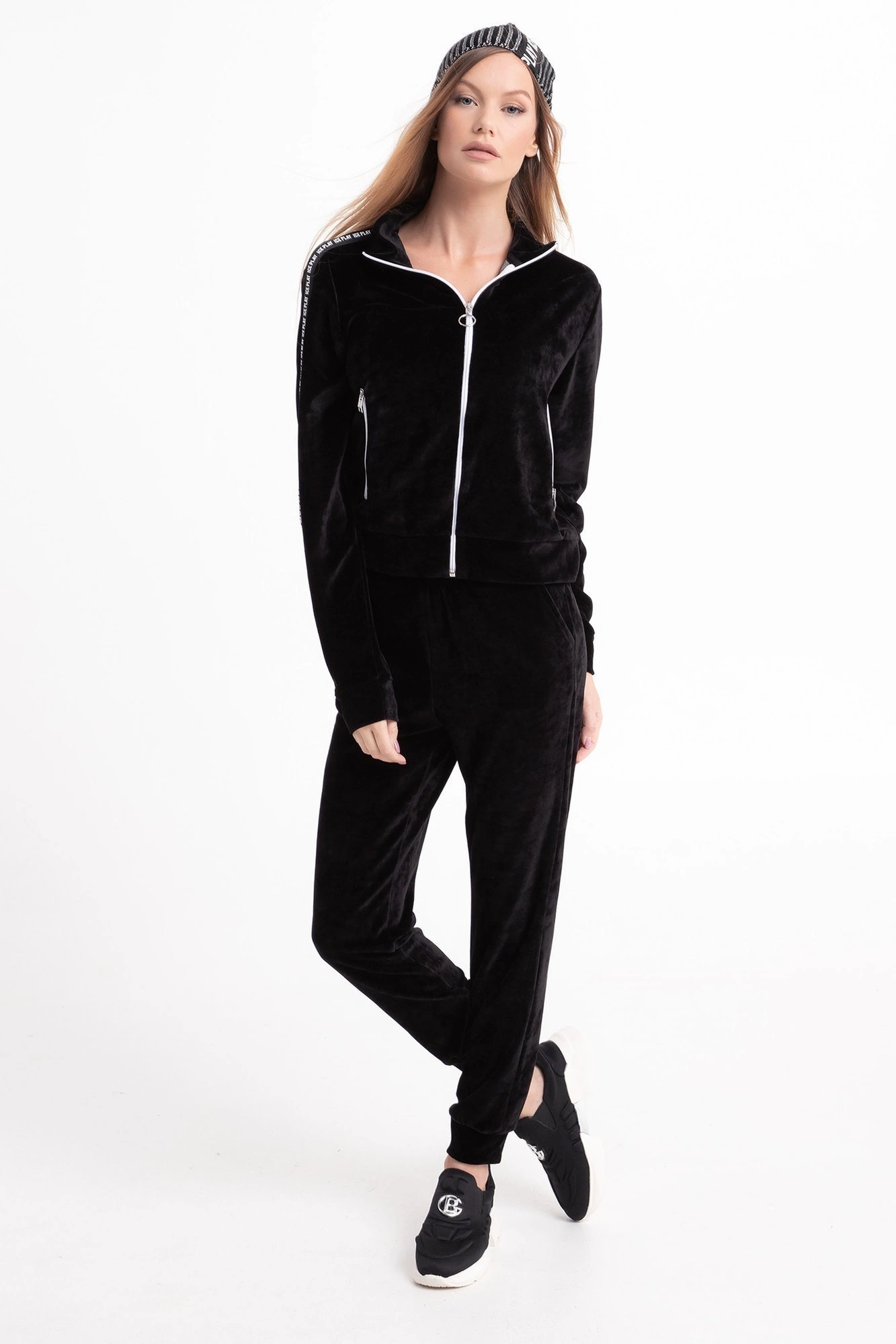 Bluza w czarnym kolorze. Zapinana na biały suwak. Po bokach dwie kieszenie. Na rękawach ozdobne lampasy z nazwą marki. Dół i rękawy wykończone ściągaczem. Bluza wykonana z najwyższej jakości materiału typu welur. Bardzo wygodna i stylowa.