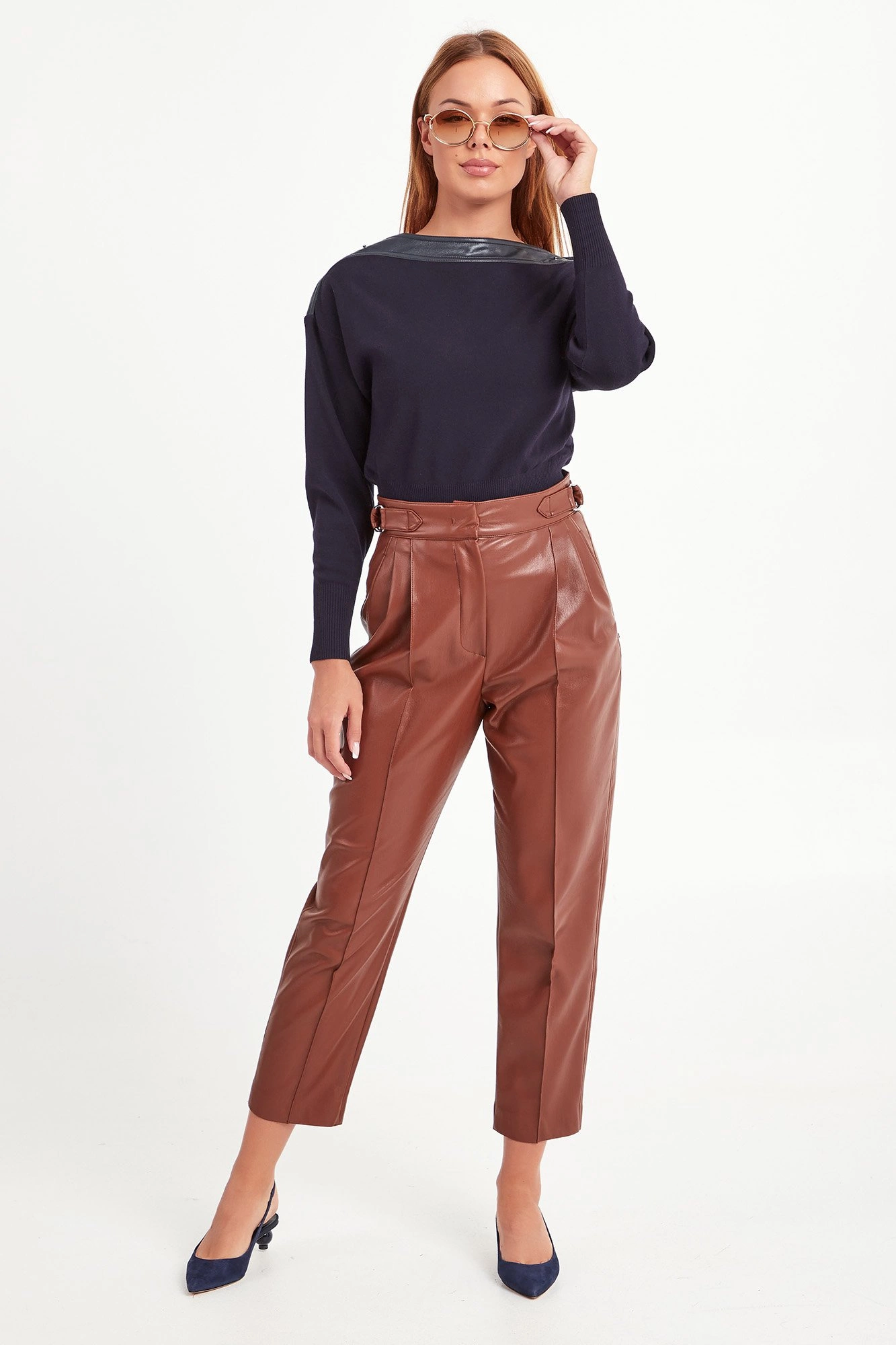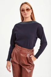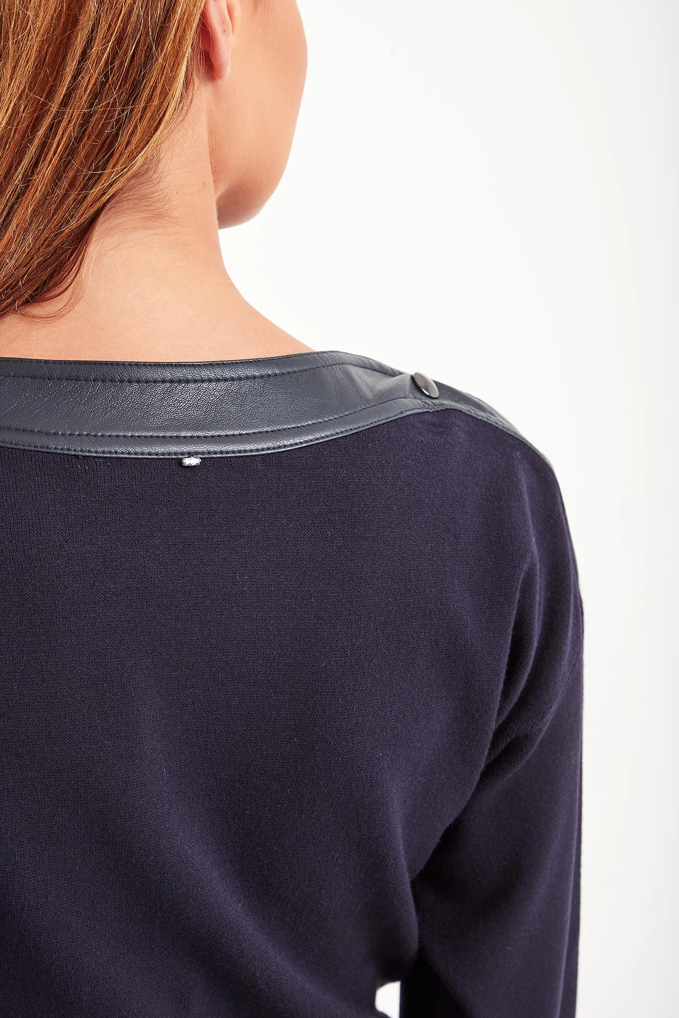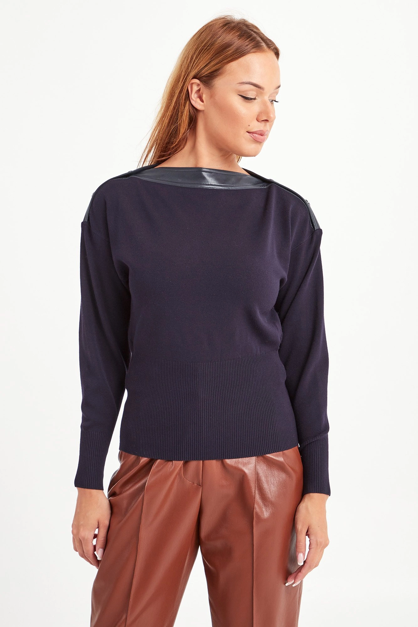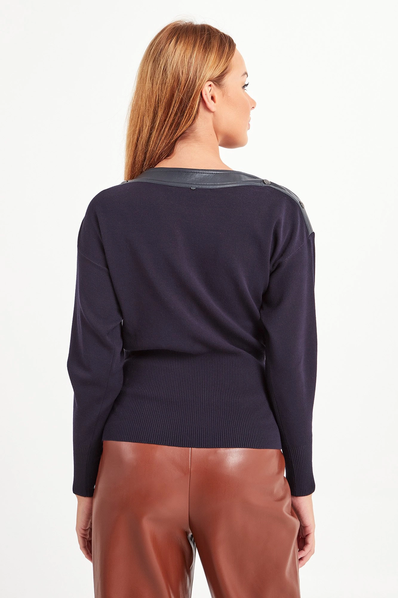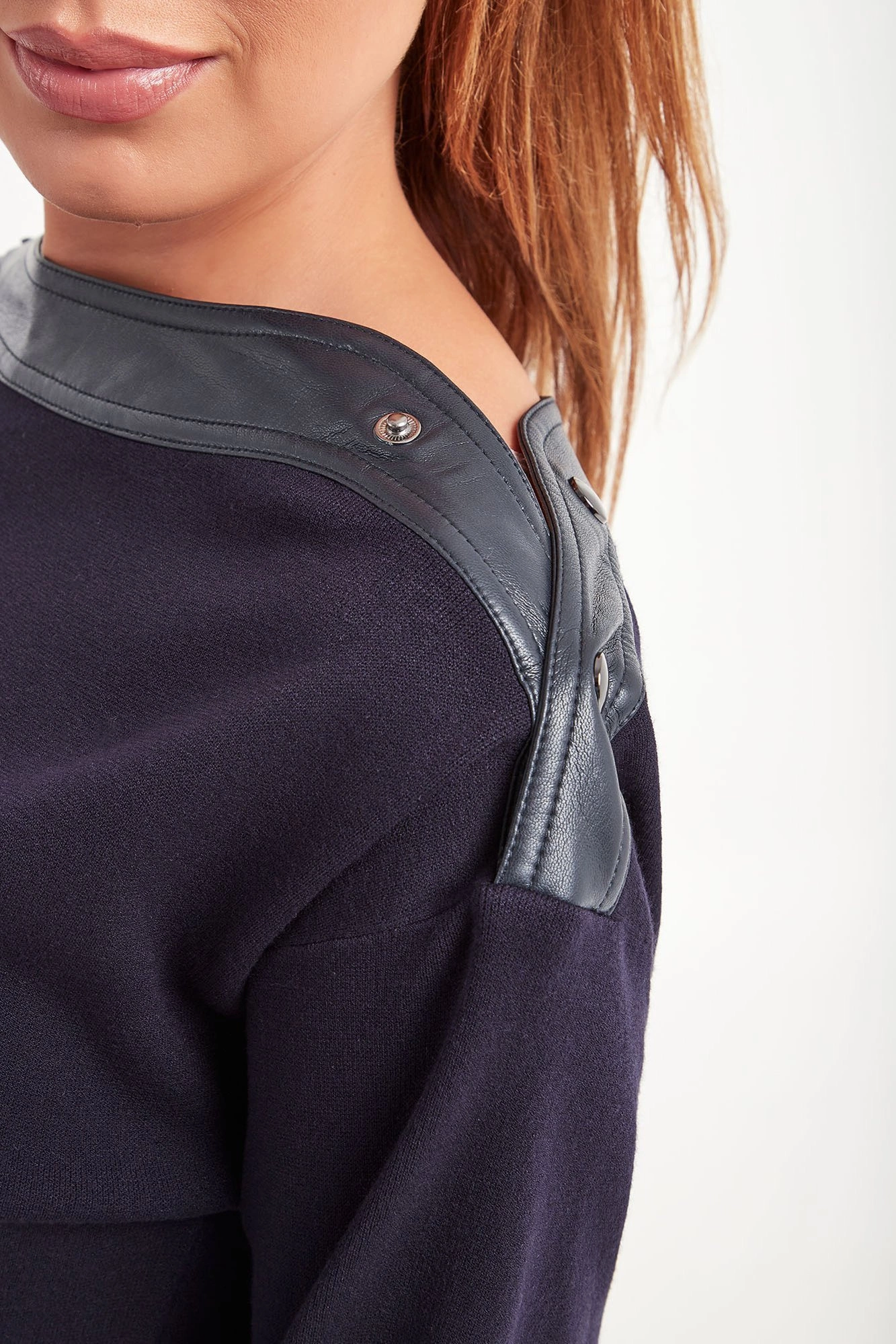 Stylowy sweter w kolorze granatowym o luźniejszym kroju. Na ramionach i wzdłuż dekoltu wstawka z ekoskóry zapinana na napy. Rękawy i dół wykończone szerokim ściągaczem. Sweter wykonany z najwyższej jakości, przyjemnej w dotyku dzianiny. Niezwykle szykowny i efektowny. Idealny do jesiennych stylizacji.
