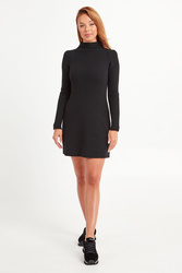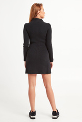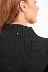 Klasyczna sukienka w czarnym kolorze. Na całości prążki. Fason slim fit. Dekolt wykończony półgolfem. Dół delikatnie rozkloszowany. Z tyłu niewielki kryształ, charakterystyczny dla marki. Sukienka wykonana z wysokiej jakości wełny. Miękka, ciepła i kobieca. Długość mini.