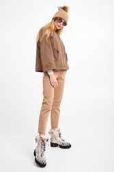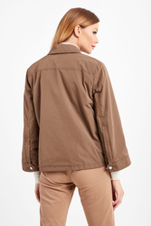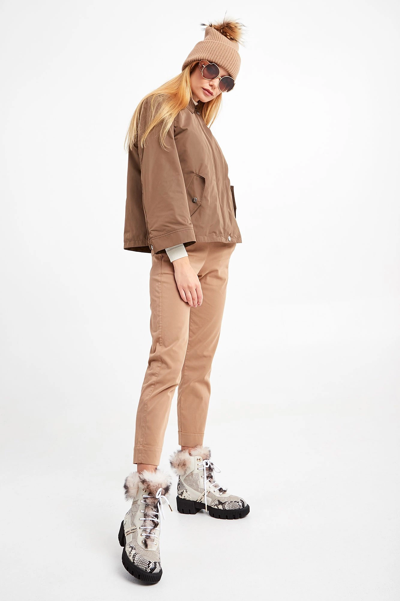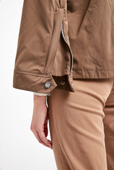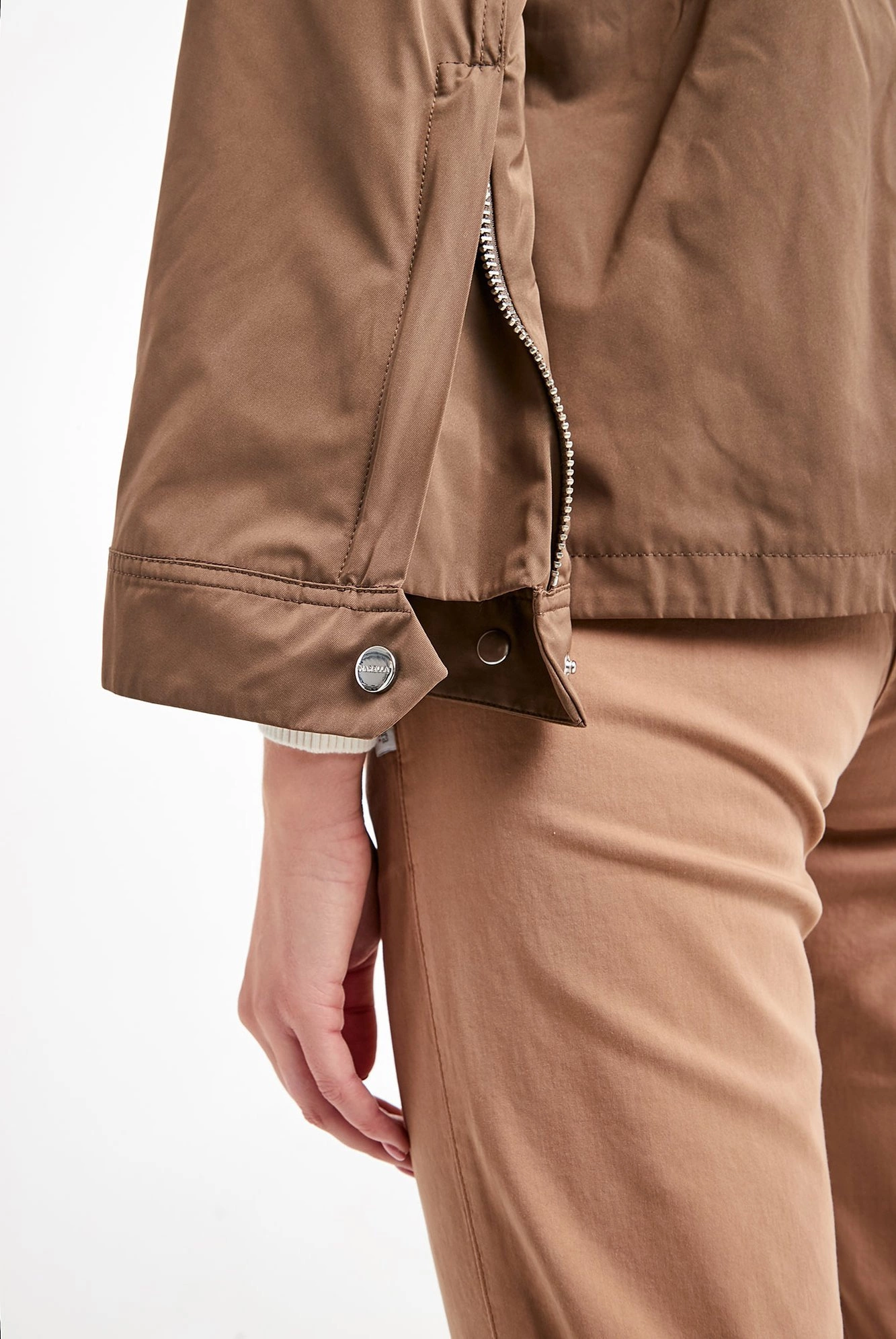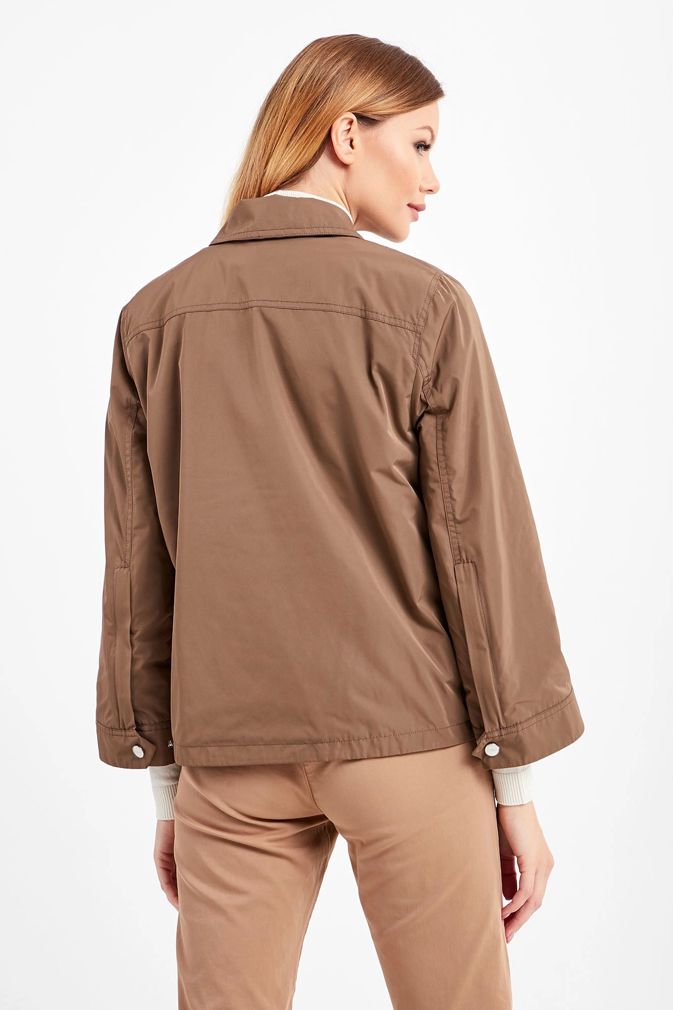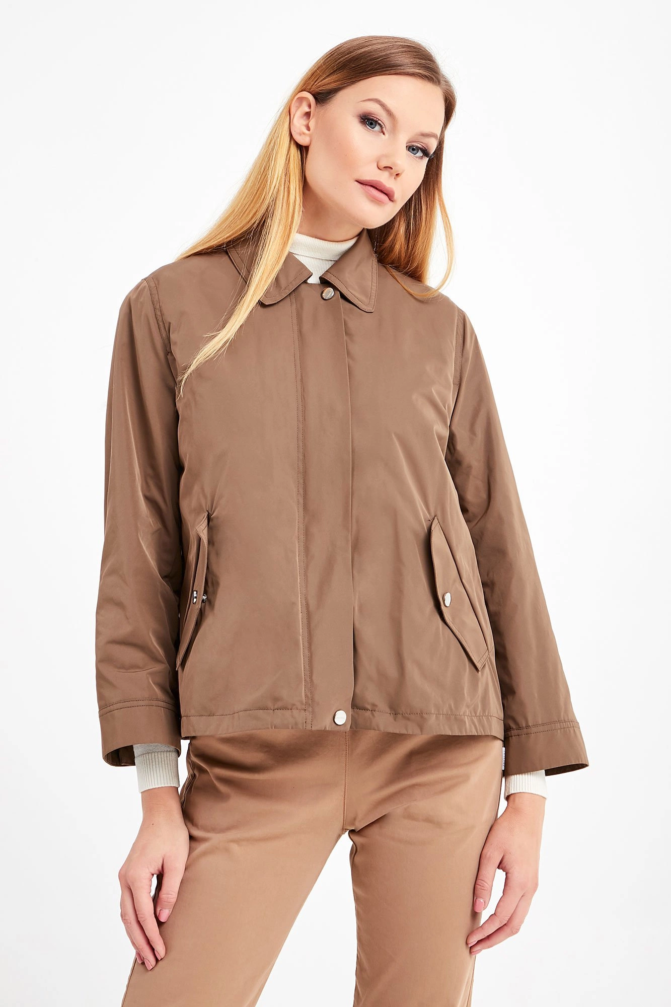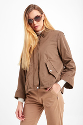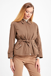 Klasyczna kurtka w brązowym kolorze. Zapinana na zamek ukryty pod plisą. Dekolt wykończony kołnierzykiem. Z przodu dwie kieszenie. Na rękawach dodatkowa regulacja szerokości w postaci zamka i zakładki z napą. W komplecie tkaninowy pasek umożliwiający wiązanie. Kurtka wykonana z najwyższej jakości materiałów. Lekka i wygodna.