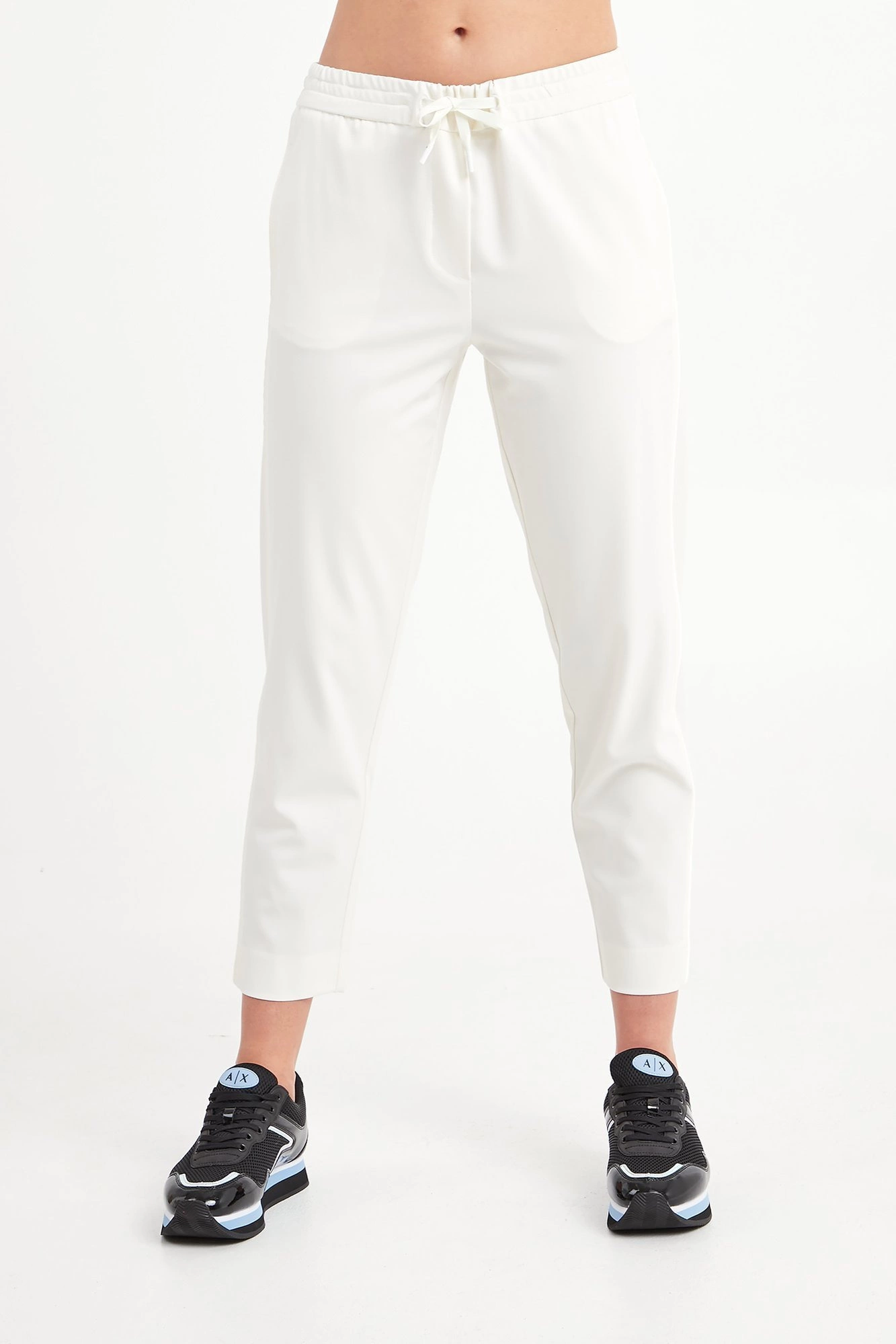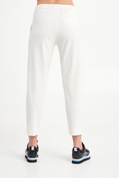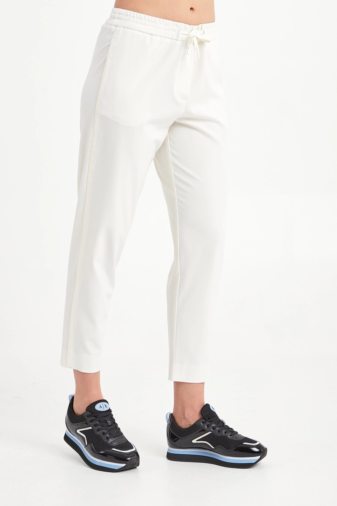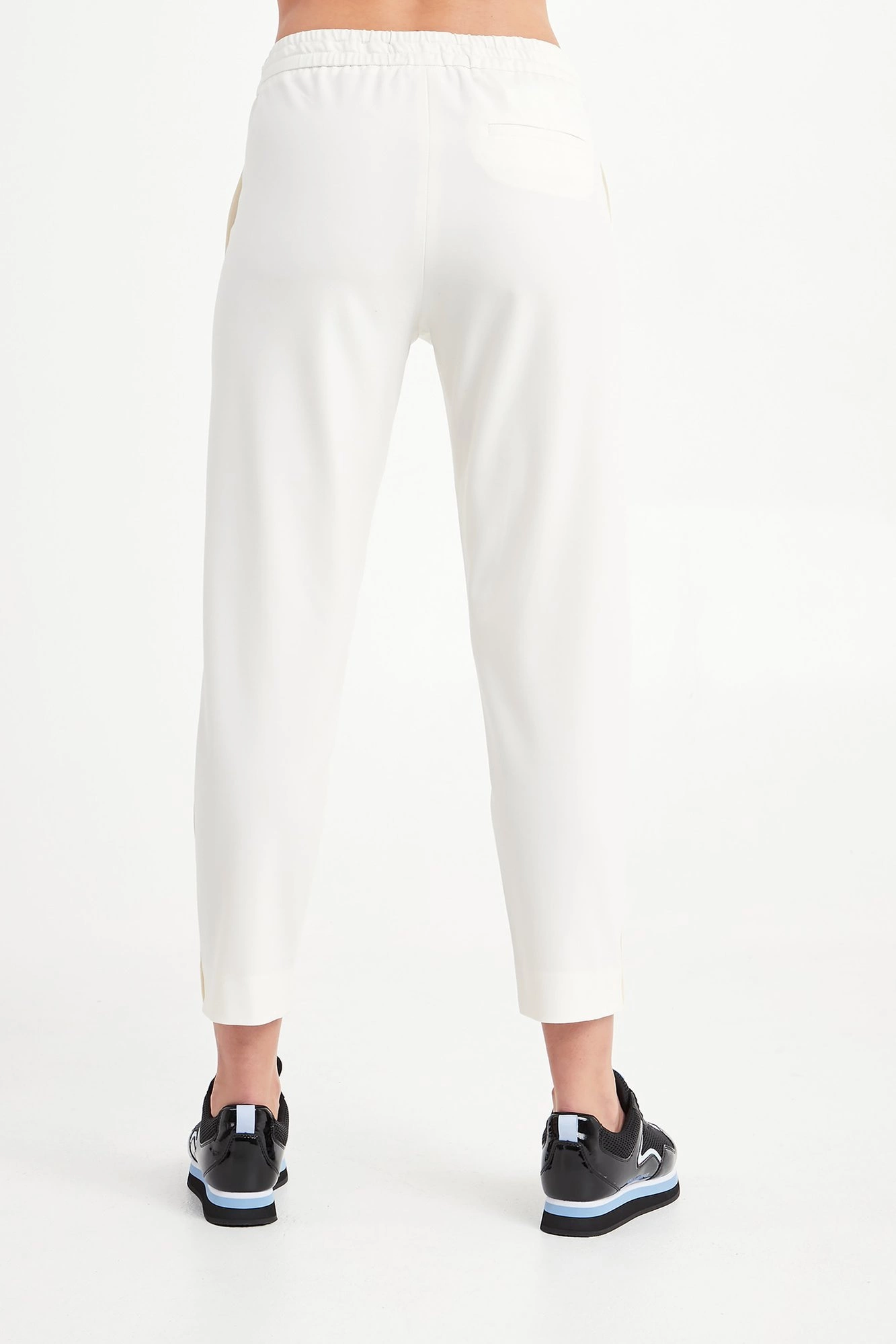 Spodnie w kolorze ecru. Pas elastyczny regulowany za pomocą troczków we wzór z nazwą marki. Model z dwiema kieszeniami. Z tyłu imitacja jednej. Nogawki delikatnie zwężane, ozdobione na całej długości wstawką. spodnie wykonane z wysokiej jakości materiałów. Idealne do formalnych i casualowych stylizacji.